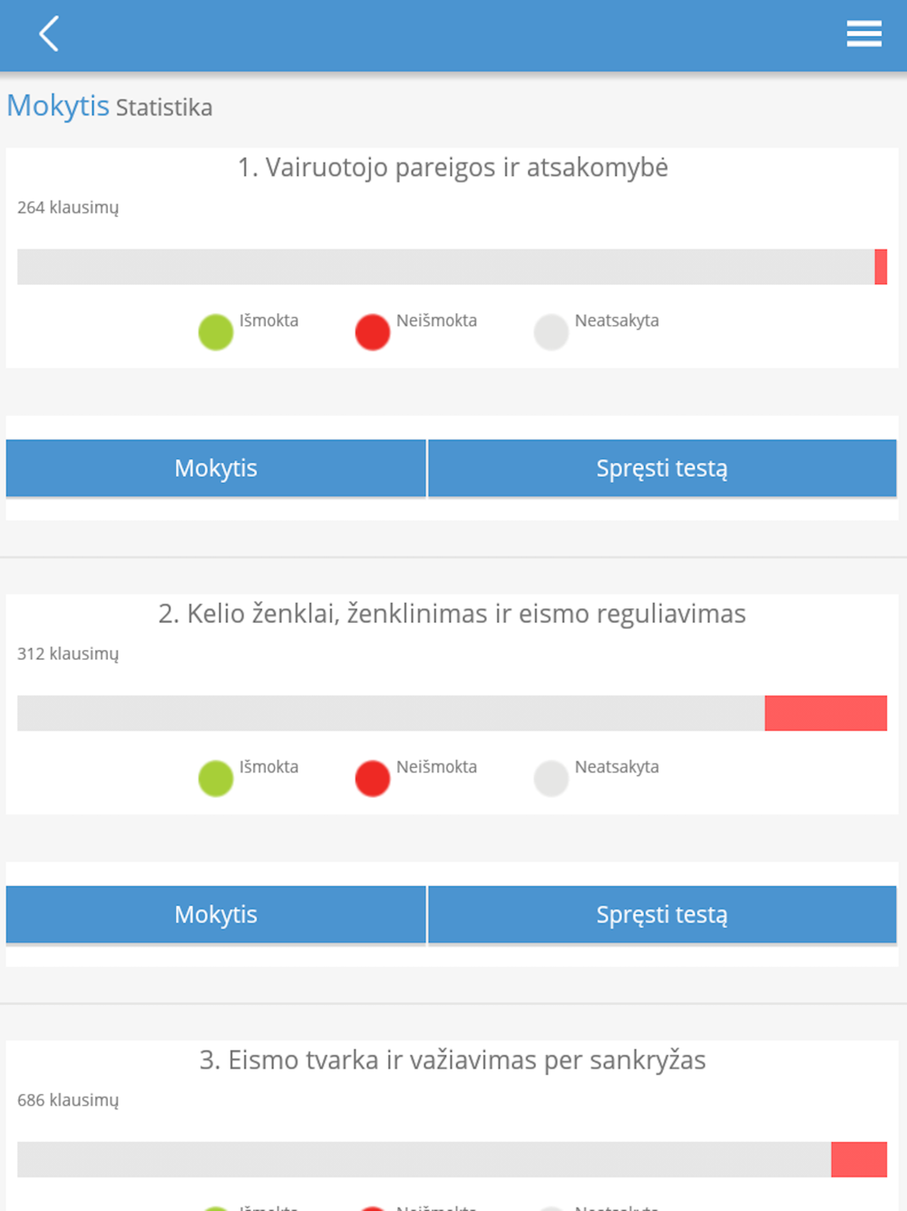 Mokydamiesi jūs galite pasirinkti testą tik iš „neišmoktų“ klausimų. Jums bus pateikti tik klaidingai atsakyti klausimai. Taip daug greičiau pasiruošite vairavimo teorijos egzaminui VĮ „Regitra“.