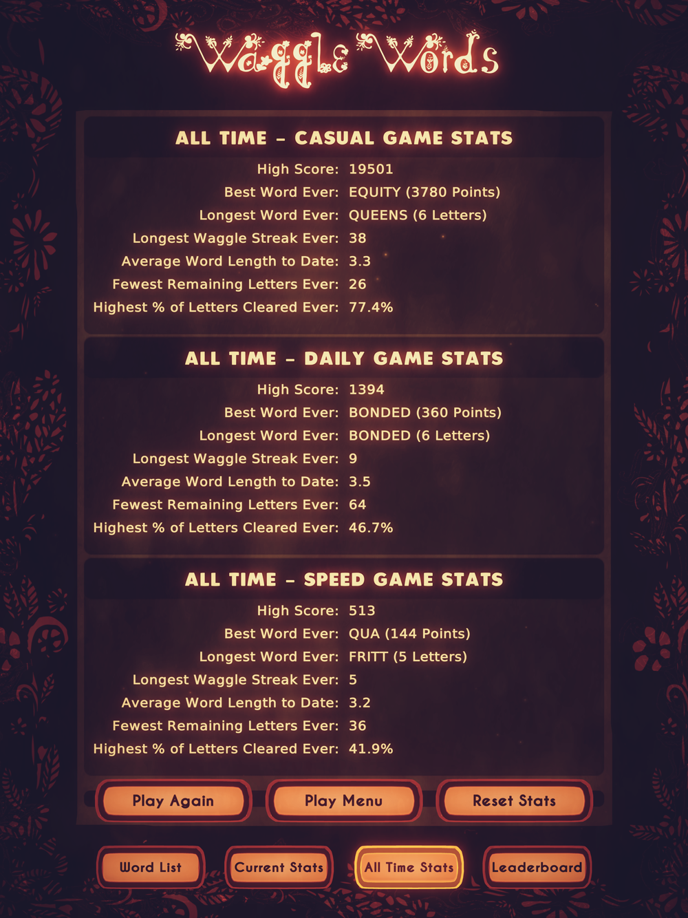 Waggle Words is a strategic word search game set inside a beehive. Flying letters, chains of words, and a swarming hive keep the energy high! Players seek and select words with the goal of clearing the board. Create chains of words to greatly multiply your points. Power-ups let you move and manipulate letters to build new words, create longer chains, and clear the board. With three different game types, plus an augmented reality mode for supported devices, game play is always new and exciting.