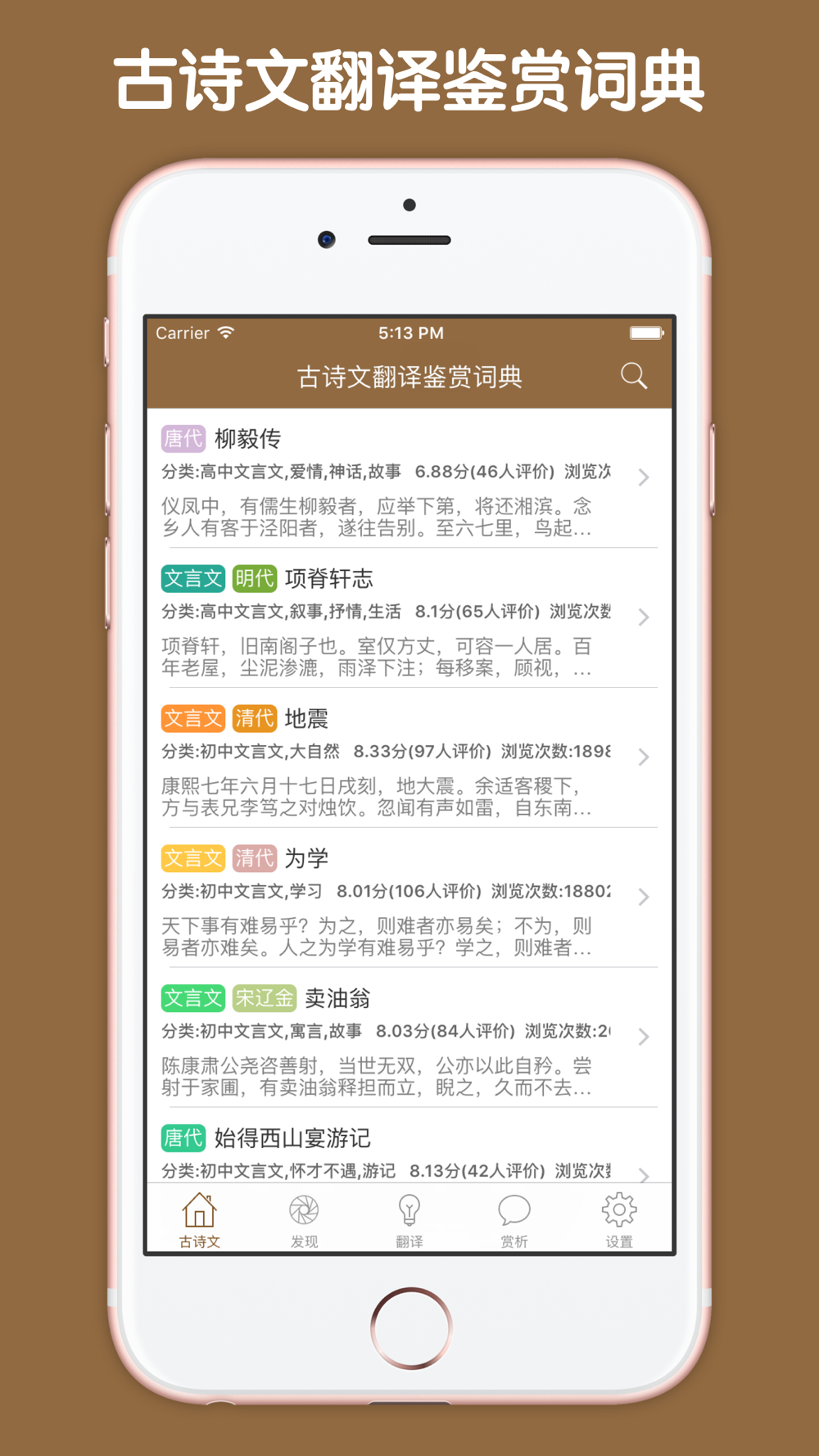 我们精选出古诗词中的名篇名句,加以点评,供广大诗词爱好者欣赏学习。文章短小精炼,适合茶余饭后品读。每一篇作品均有内容、特色、注释、赏析等栏目。对典故和难懂的字句,一部分在注释栏目中加以解释,另一部分随文患角;以赏析为重点,一般一作品一赏析,但也有数篇作品合而缀以一文的。选出的佳句以突出形式摆放,一目了然。还列有部分作者的逸闻。