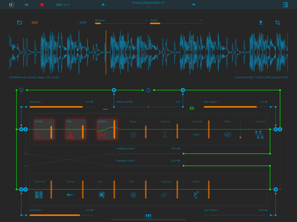 You can move the effects along two chains, and get endless combinations of incredible sounds. ALL the App parameters can be modulated with dedicates LFO (one independent LFO for each parameter!).