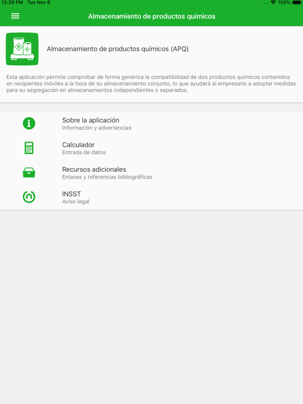 Esta aplicación permite comprobar de forma genérica la compatibilidad de dos productos químicos contenidos en recipientes móviles a la hora de su almacenamiento conjunto.