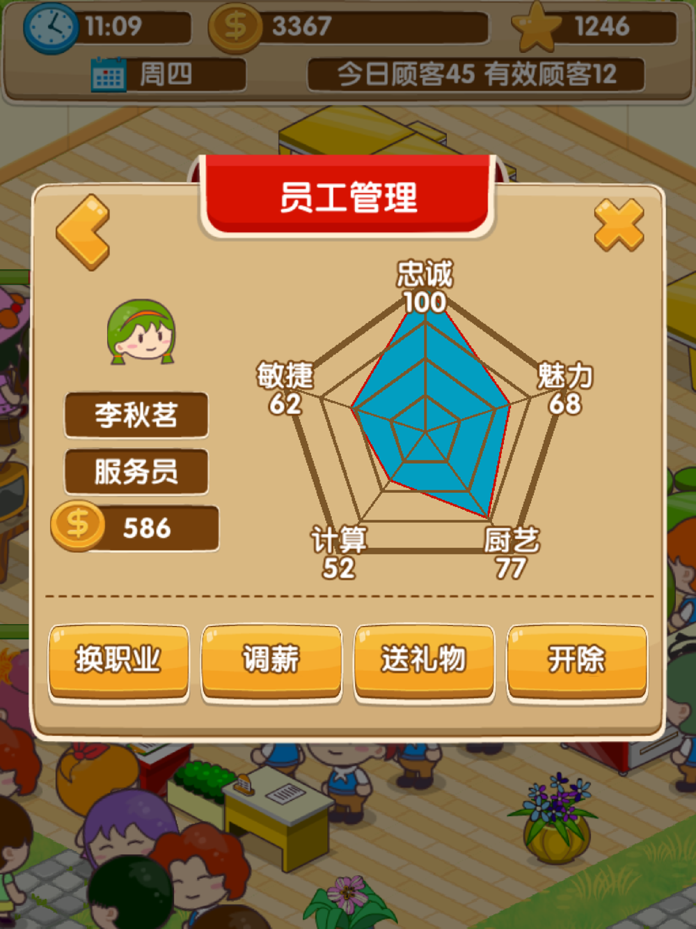 你的员工各自才干不同,敏捷高的人适合做服务员,厨艺好的适合做厨师,计算好的适合做收银员,魅力高的适合做迎宾。
