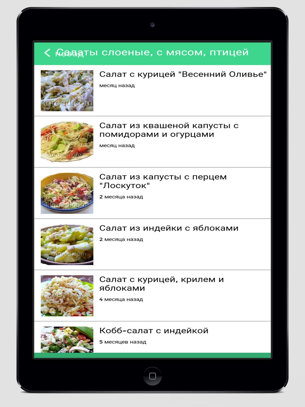 В нашем приложении Вы найдете множество рецептов салатов – слоеных, овощных, мясных, рыбных, низкокалорийных и многих других.