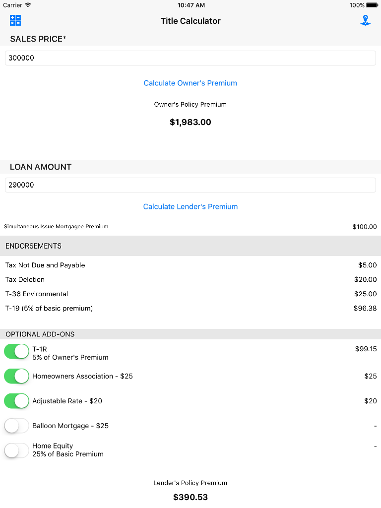 Texas real estate professionals enjoy this powerful, user-friendly app for calculating title costs on various types of transactions. New Purchases and Refinances take just a few taps to run title policy premiums. Accurately calculate closing costs, cash to close, and sales proceeds using the Buyer Cost Sheet and Seller Net Sheet. Email attractive, itemized breakdowns directly from your phone, to give your clients realistic expectations for their real estate transactions.