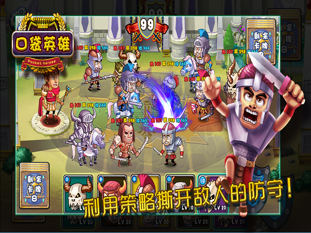 全新的游戏画面,蛮族,守卫,骑士等全新角色,每一个回合都是实力与智慧的较量,惊险刺激的关卡,让你和你的将士们一起完成伟业!每一款角色卡牌都是精心独创,好好使用,完成帝国战争的奇迹