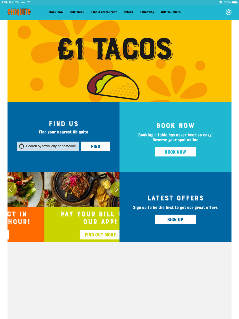 Find your nearest Chiquito or search for restaurants in a specific town or postcode. Book straight from the app, check out the restaurant’s facilities and contact the restaurant directly