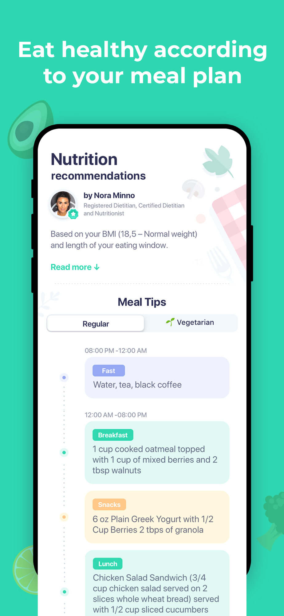 • Your individual meal plan – Get nutritionists’ recommendations of what to eat for breakfast, lunch, and dinner.