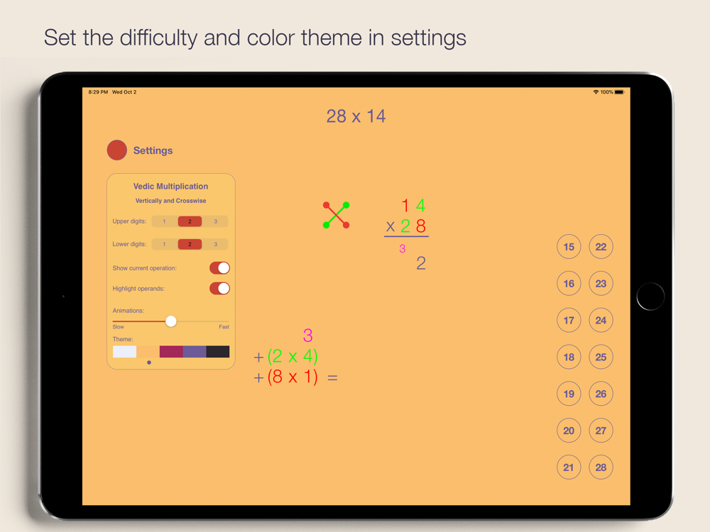 This math app is about a multiplication technique introduced by Shri Bharti Krishna Tirthaji in his book “Vedic Mathematics”, published in 1965. Tirthaji claimed to have found the mathematical content for his book in ancient sacred Hindu texts.
