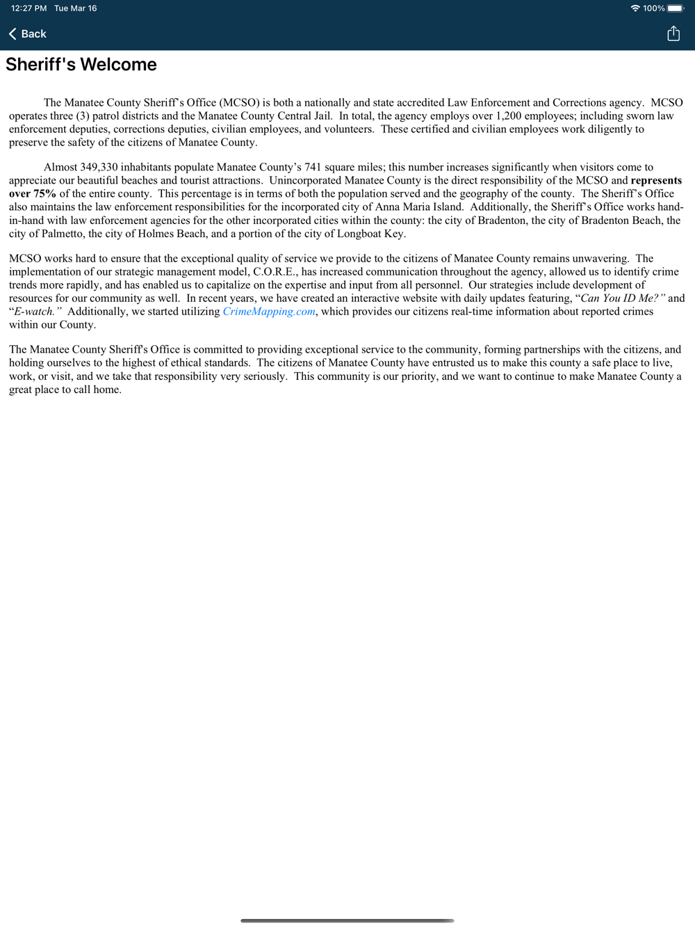 The Manatee County Sheriff's Office mobile application is an interactive app developed to help improve communication with area residents. The App allows residents to connect with the Manatee County Sheriff's Office by reporting crimes, submitting tips, and other interactive features. The app provides the community with Crime Prevention tips as well as the latest public safety news and information.