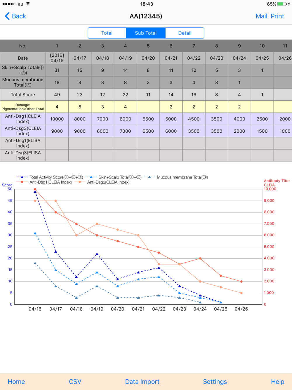The purpose of this application is to allow the Pemphigus Disease Area Index (PDAI)*1, a severity assessment technique for pemphigus, to be utilized in clinical sites and provide programs so as to manage the scores and for each patient and display graph forms. In addition, the anti-Dsg1 antibody and anti-Dsg3 antibody CLEIA index/ELISA index, and skin and scalp damage (international criteria) can be managed simultaneously.
