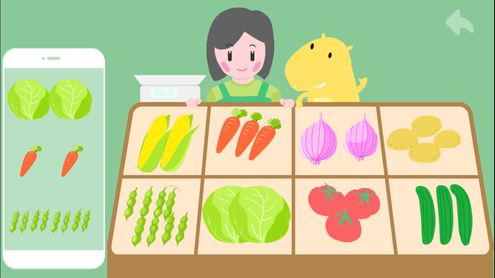 场景一:超市里有好多可爱的蔬菜宝宝,有圆滚滚的土豆宝宝,红艳艳的西红柿宝宝,绿油油的西蓝花宝宝... ...点击它们不仅会告诉宝宝它们的名字,还会飞。。。飞。。。