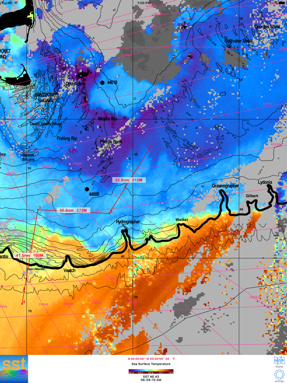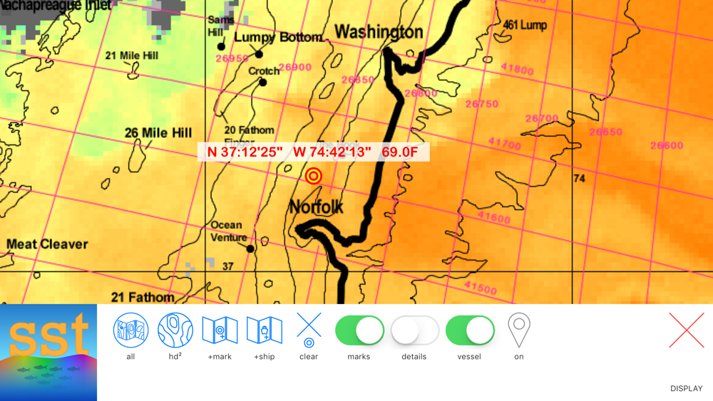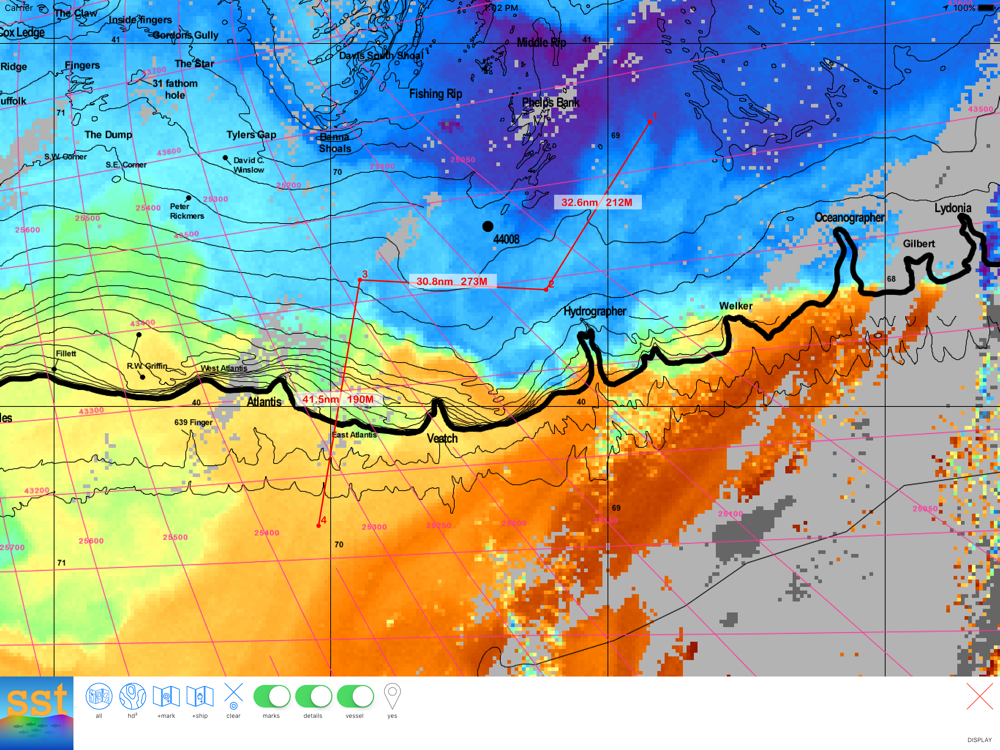 Interactive sea surface temperature, turbidity and altimetry charts with REAL TIME GPS VESSEL TRACKING! We cover the entire US East coast, the Florida Gulf coast, the Florida Keys and the Bahamas. Our HD² display technology has 3X the resolution of of other services and our detailed fishing charts and interactive chart interface are simply the best in the business. Real-time GPS vessel tracking right on our high resolution charts so you can take your iPhone or iPad with you offshore to see exactly where you are and where you need to be to find that edge and CATCH MORE FISH!