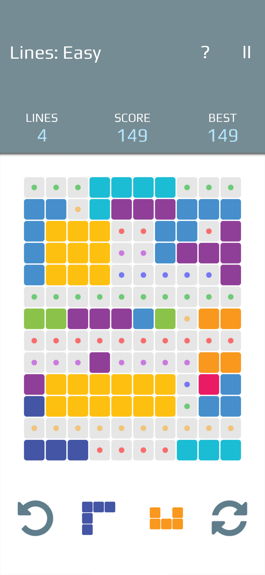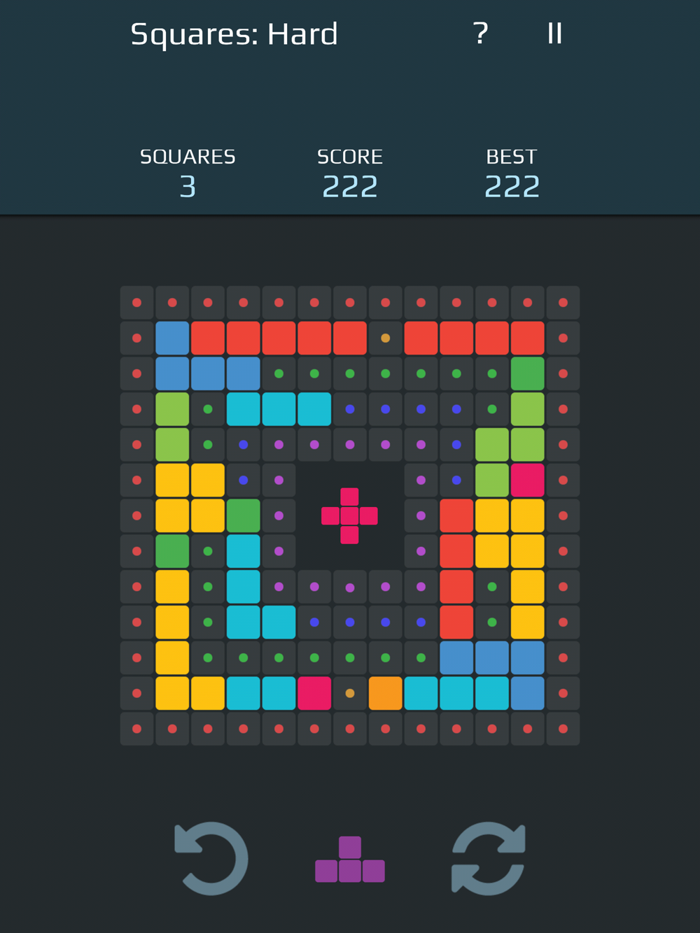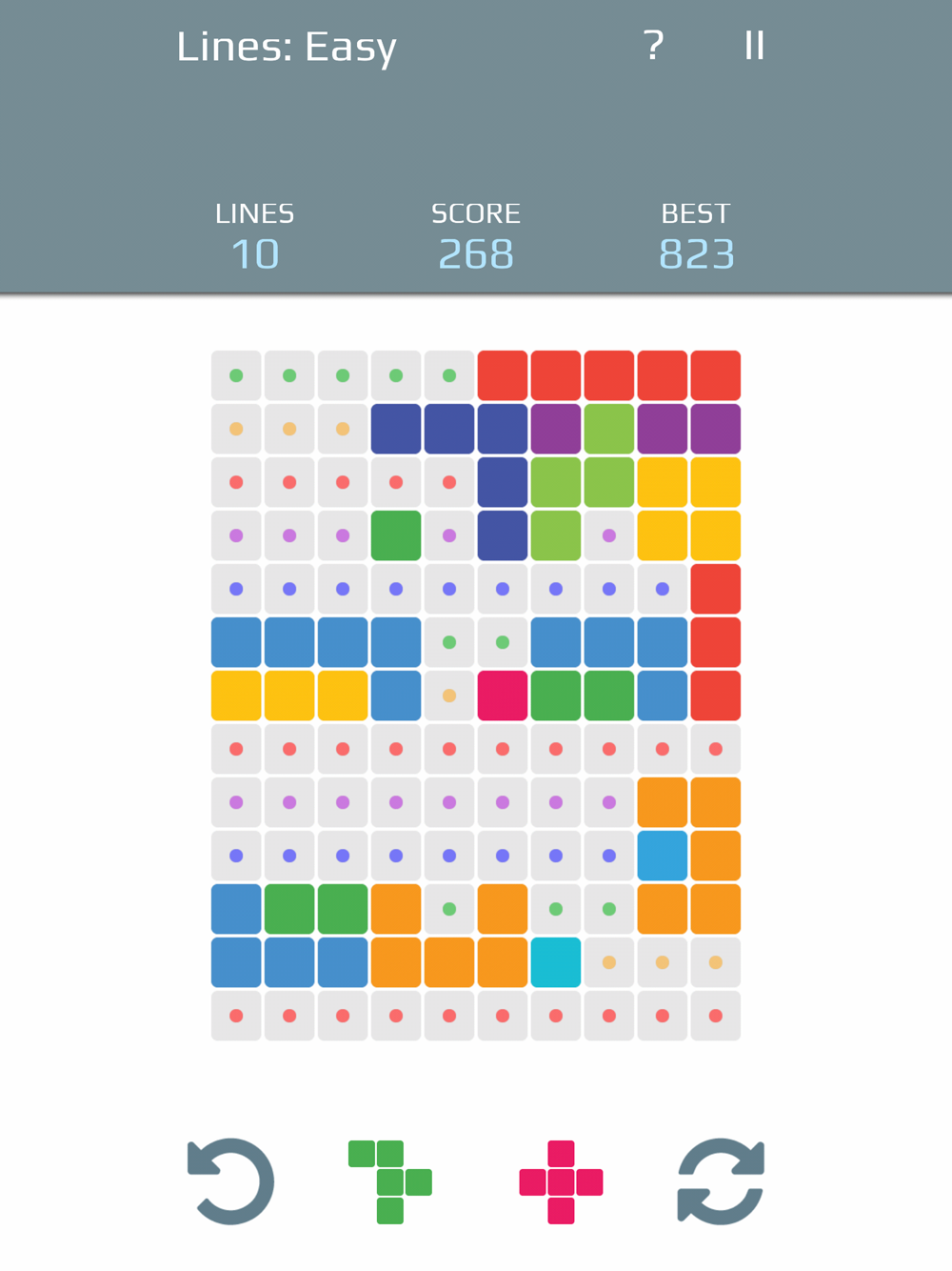 Place figures on game field to fill the places marked with the same color (squares). When you fill a square it is erased to make space for new figures, and you earn score points. Erasing the large squares gives more points. The game continues until there is a space to put the next figure. Made wrong move? The last move can be canceled unless it led to the erasing of a square.