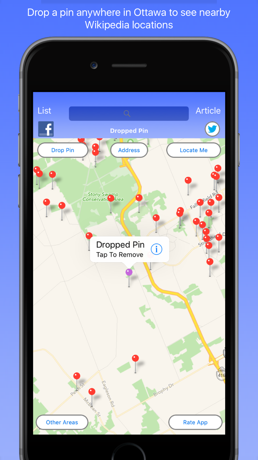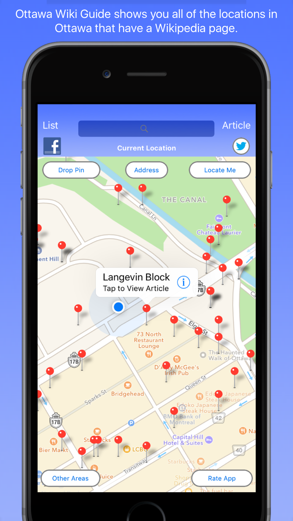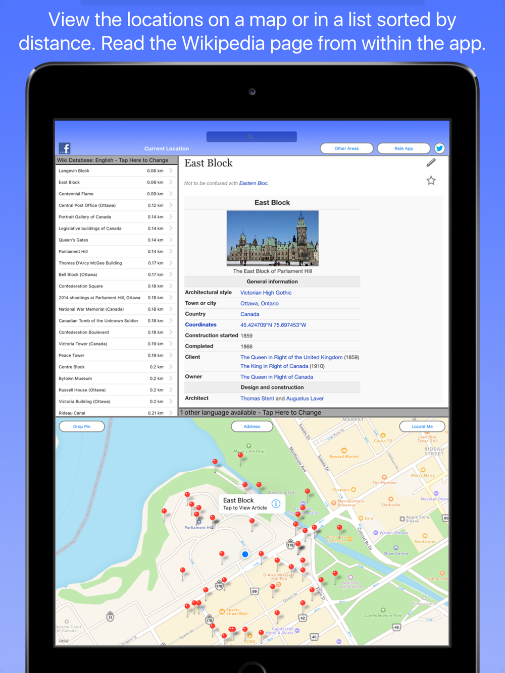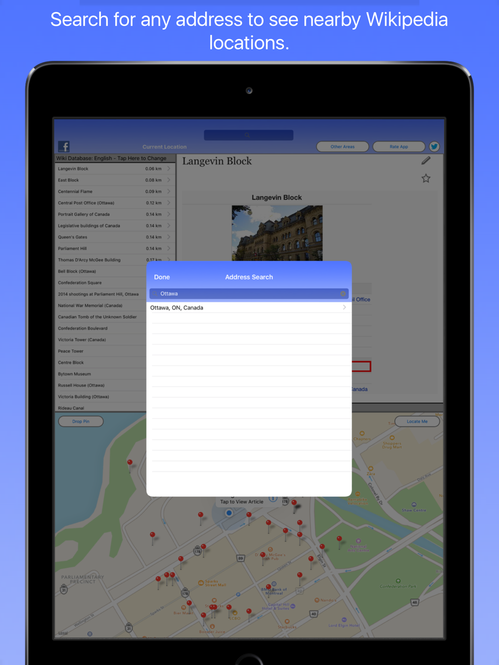 Ottawa Wiki Guide shows you all of the locations in Ottawa, Canada that have a Wikipedia page.