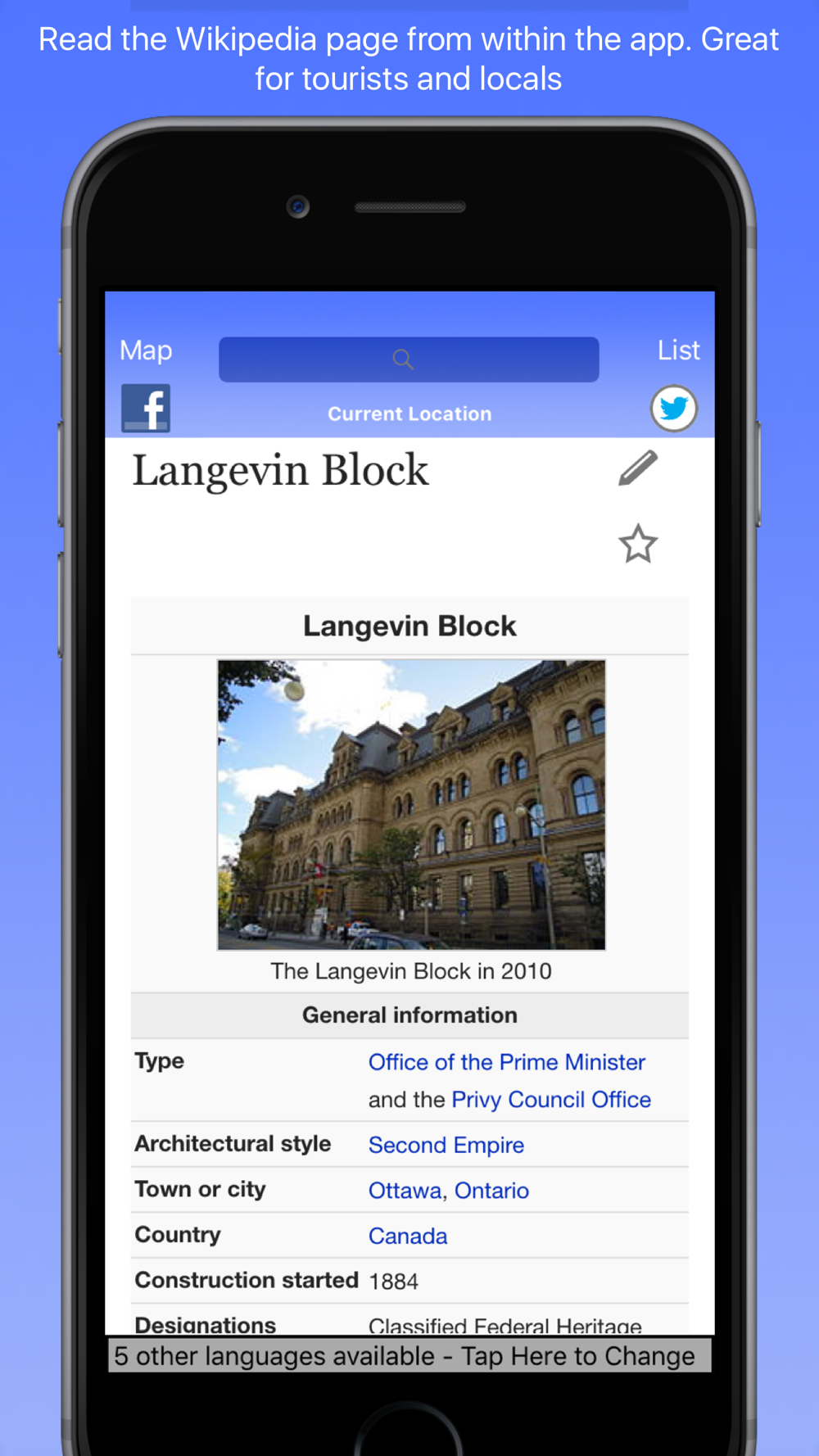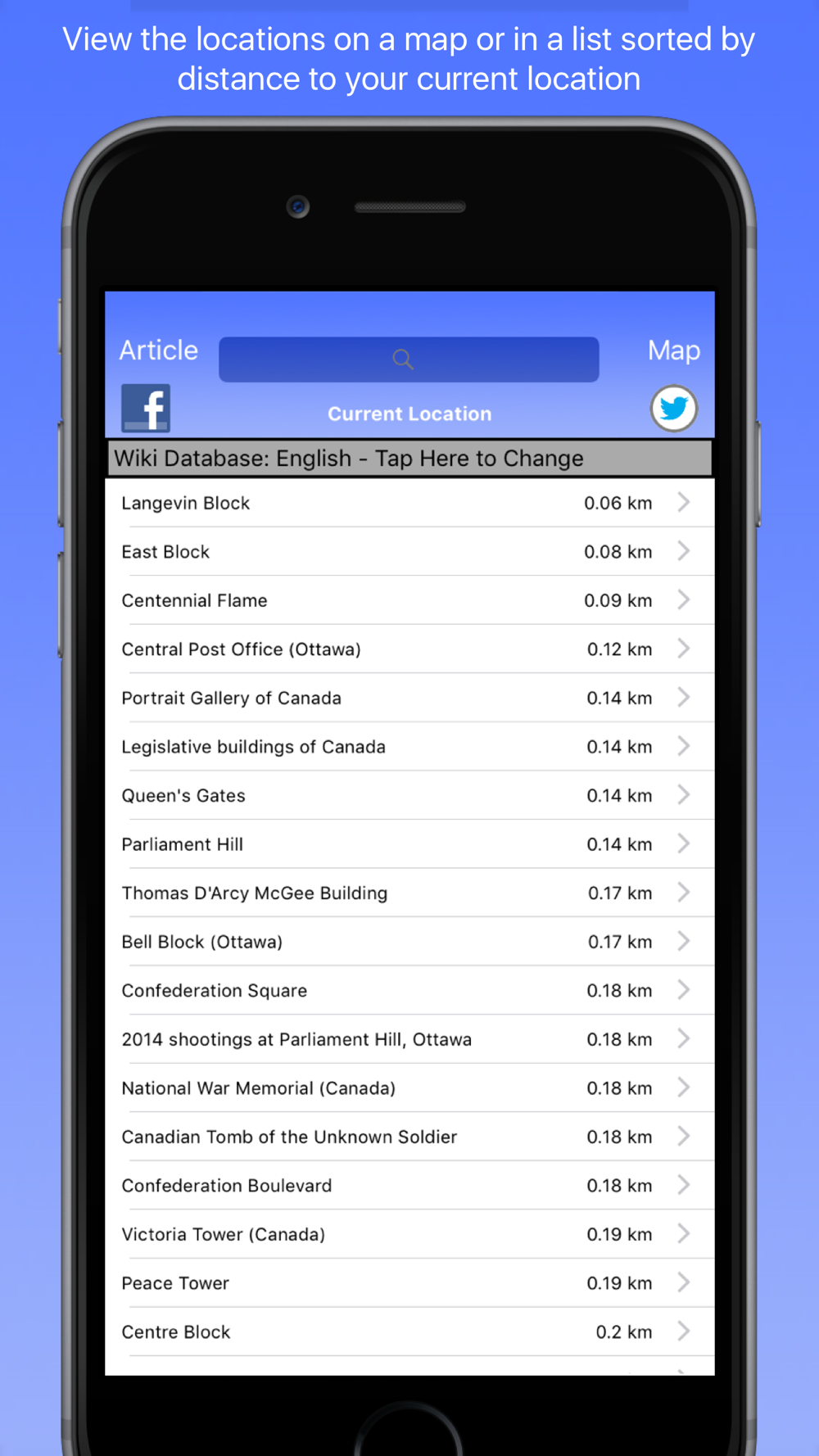 View the locations on a map or in a list sorted by distance to your location and then view the associated Wikipedia article. You can also do a search for a particular location.