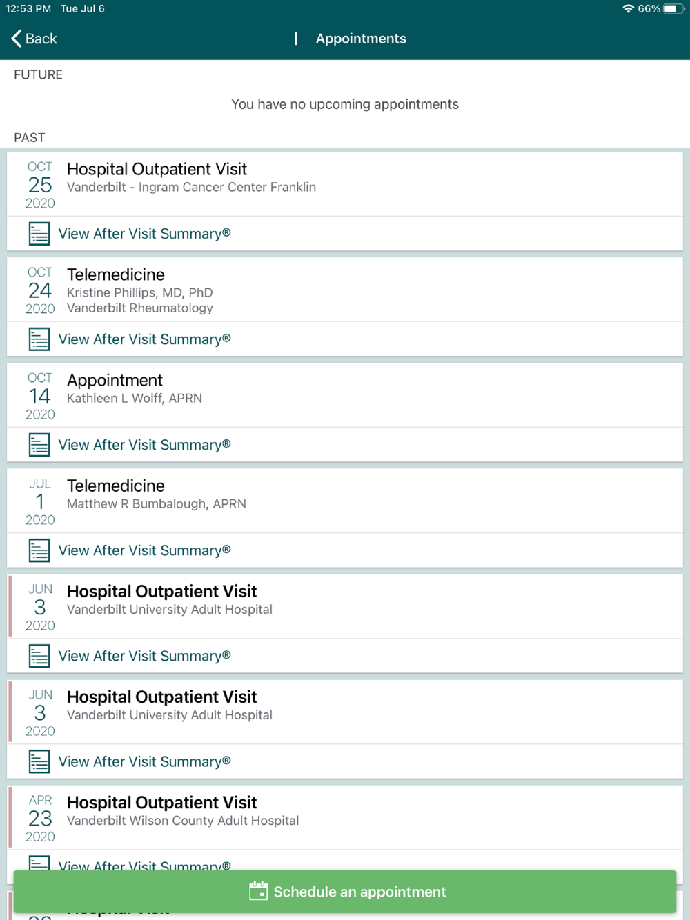 My Health at Vanderbilt is a secure tool that puts your health record in your hands. This mobile version includes some of our most popular features, with convenient access on the go.