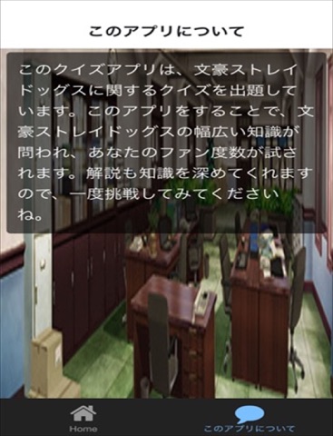 このクイズアプリは、文豪ストレイドッグスに関するクイズを出題しています。このアプリをすることで、文豪ストレイドッグスの幅広い知識が問われ、あなたのファン度数が試されます。解説も知識を深めてくれますので、一度挑戦してみてくださいね。