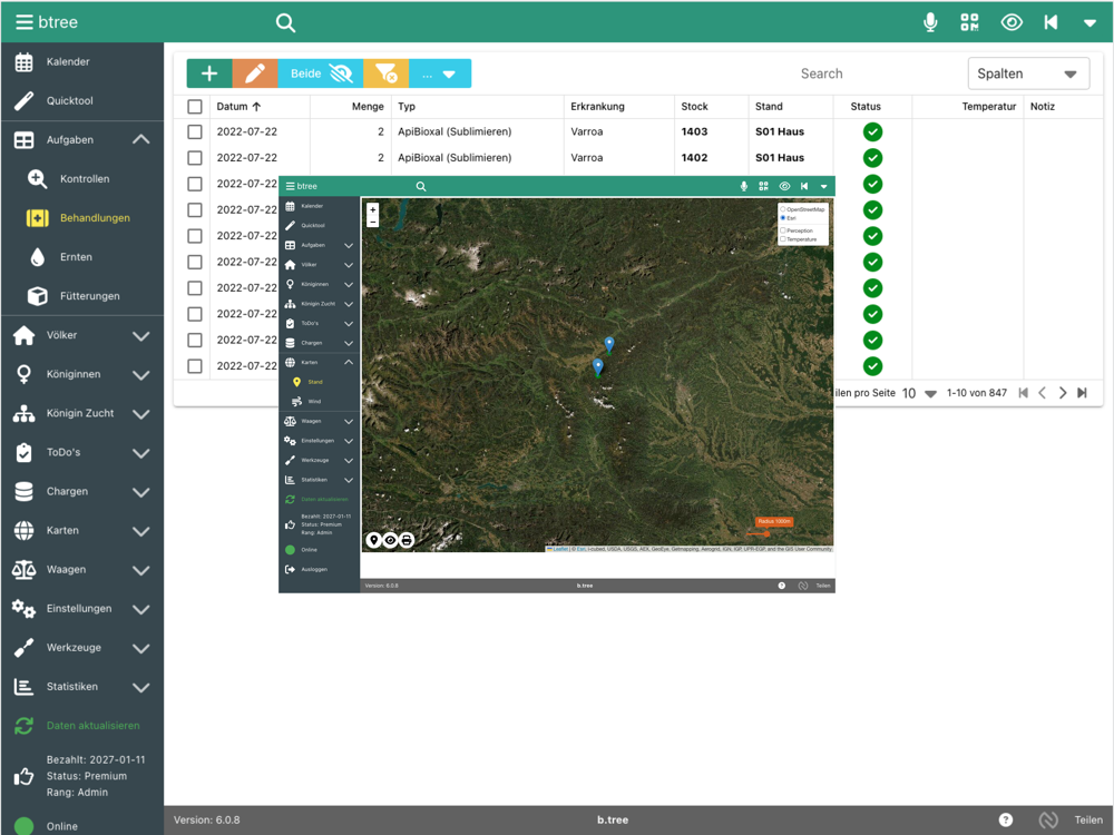 This beekeeping web application was made to help beekeepers manager their tasks and have a quick overview. You add your feedings, harvests, treatments, checkups and much more. Move hive/colonies between apiaries and also manage your bee queens on your colonies. You can create your own rearing methods and edit most options to your needs (eg. hive type, feeding type, treatment methods, ...). Apiaries are easily managed with an apiary map which features satellite images and weather overlays for premium users.