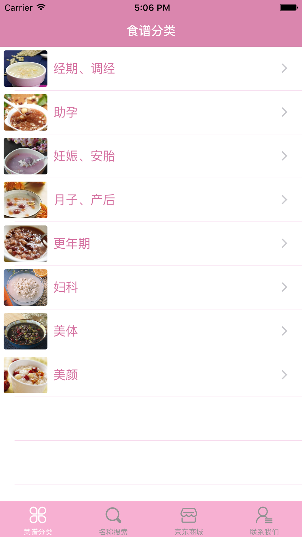 分类全: 有经期, 怀孕, 安胎, 坐月子, 更年期, 妇科, 减肥, 美白祛斑, 祛湿排毒, 祛痘丰胸, 补气养颜等针对性的食疗食补分类