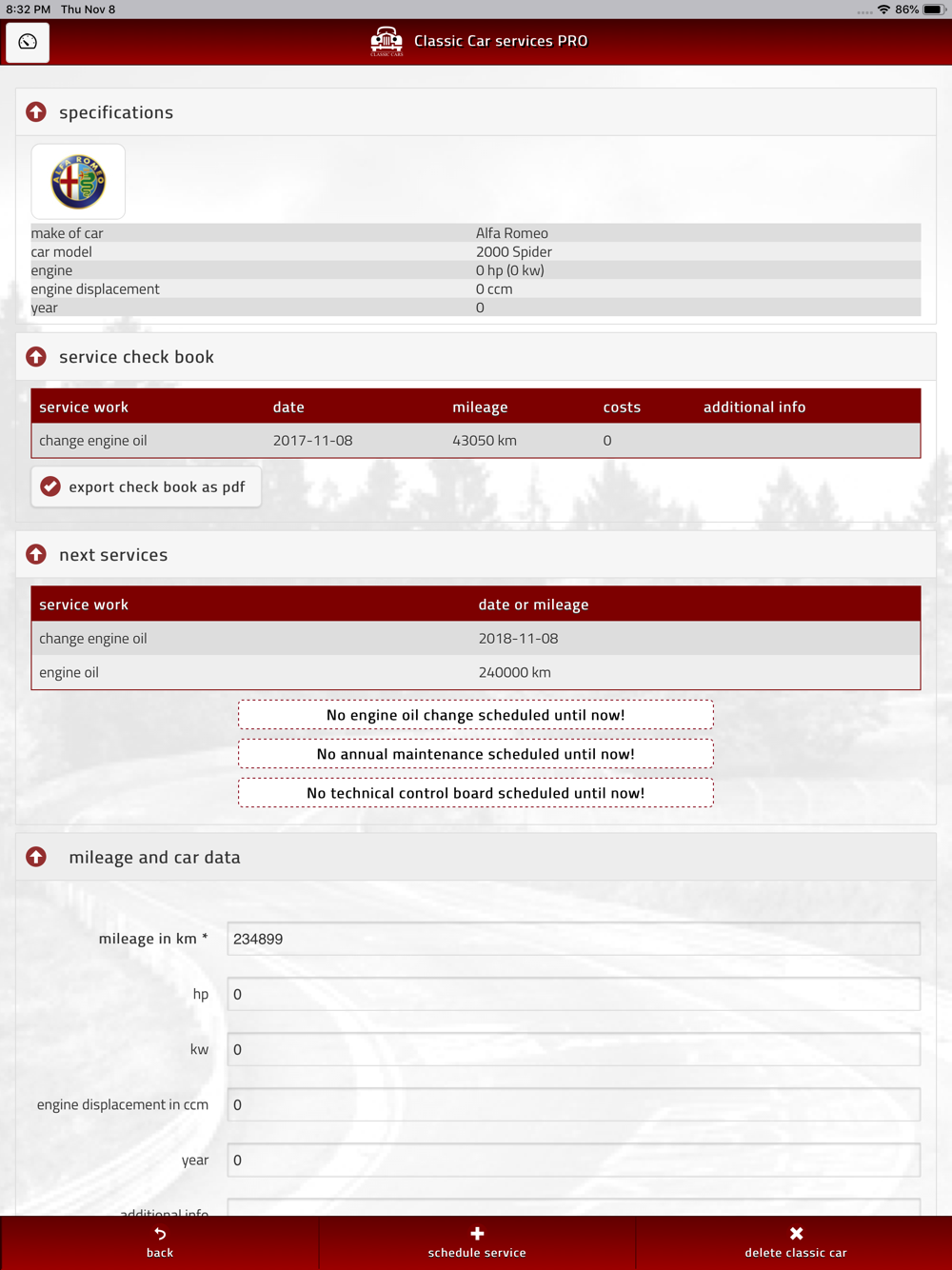 Without regular maintenance, the classic car quickly looses character and as a consequence also value. To keep the mobile jewel true to the original and in this way unique, the app offers a Service Reminder, reminding the owner of service appointments, including expected costs, at given times of the day.