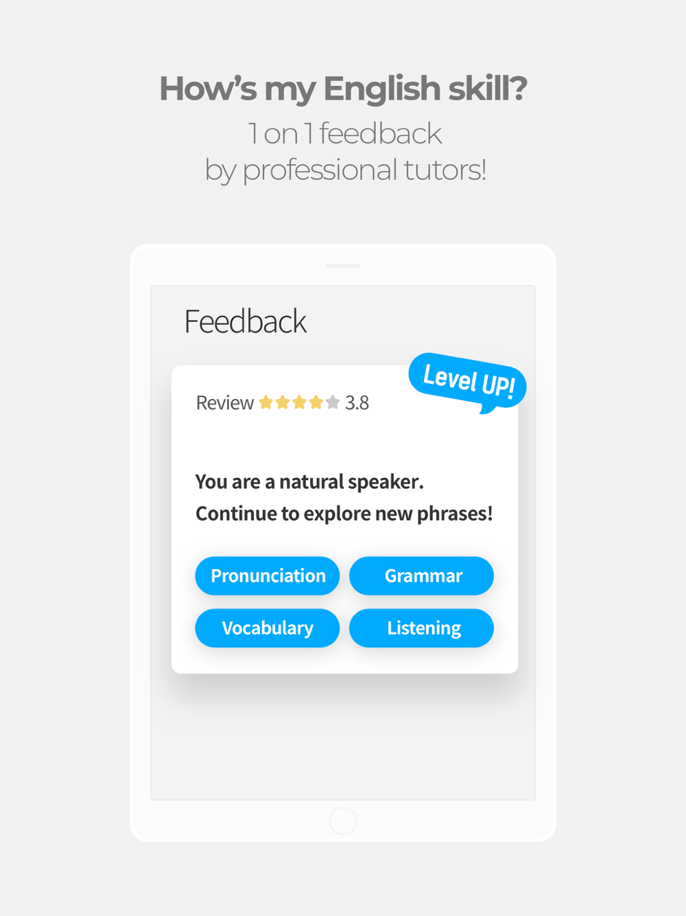 TUTORING provides thousands of topics to meet your interests and goals for studying English, furthermore, the topics are updated and added everyday! You don't need to buy or prepare any learning materials! Everthing is on the palm of your hands - just swipe the pages through your app that is synced with the tutor's side.