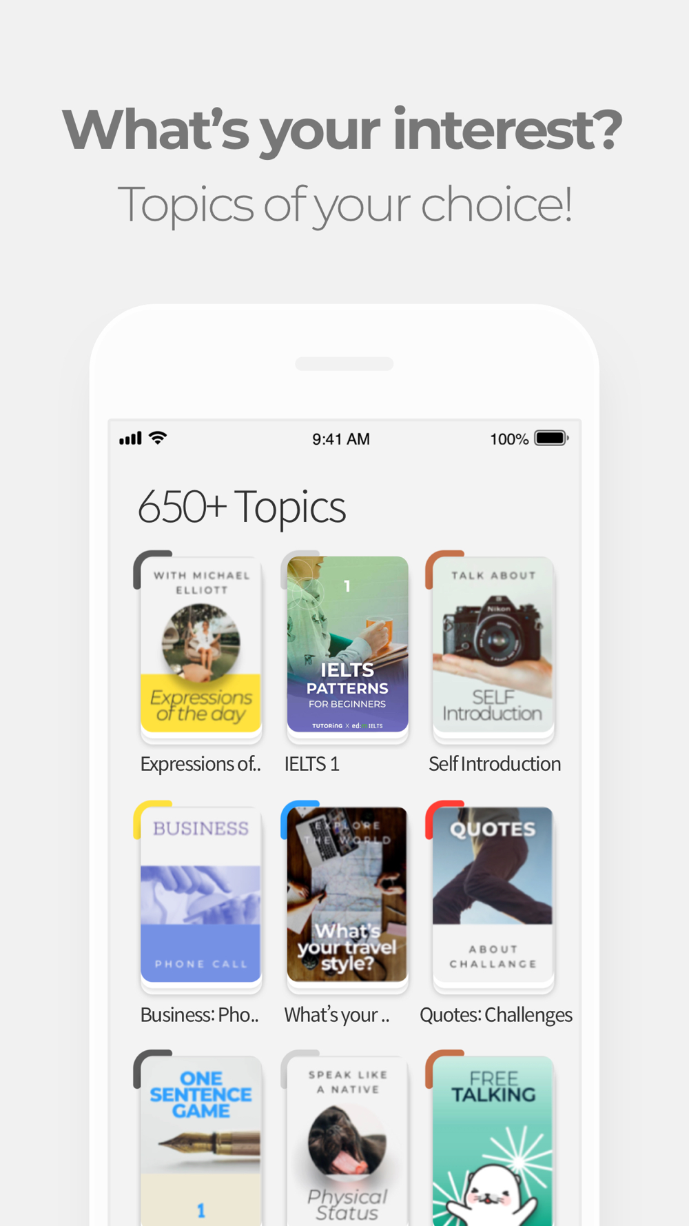 We provide hundreds of native English tutors for you to have 1 on 1 English lessons. You just need to download the app, browse the tutors on standby and you're reday to start your private 20 minute lesson whenever, and wherever. We also provide hundres of topics that you can have your lessons with - from small talks to business English. You can also prepare for test such as TOEFL, IELTS, and TOEIC.