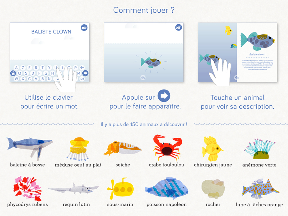 - Tu peux écrire directement les mots POISSON, REQUIN, CORAIL, ALGUE, TORTUE...