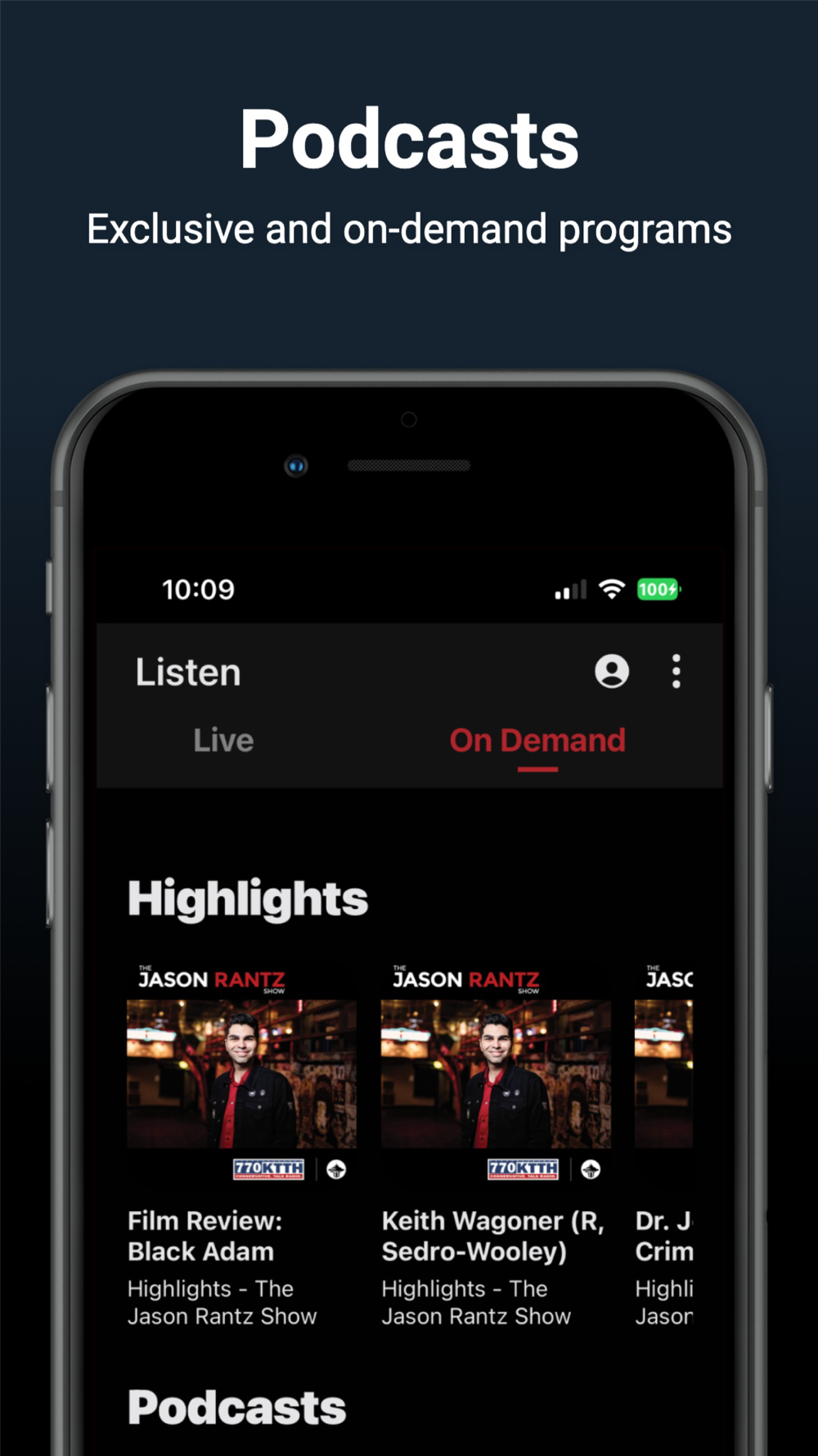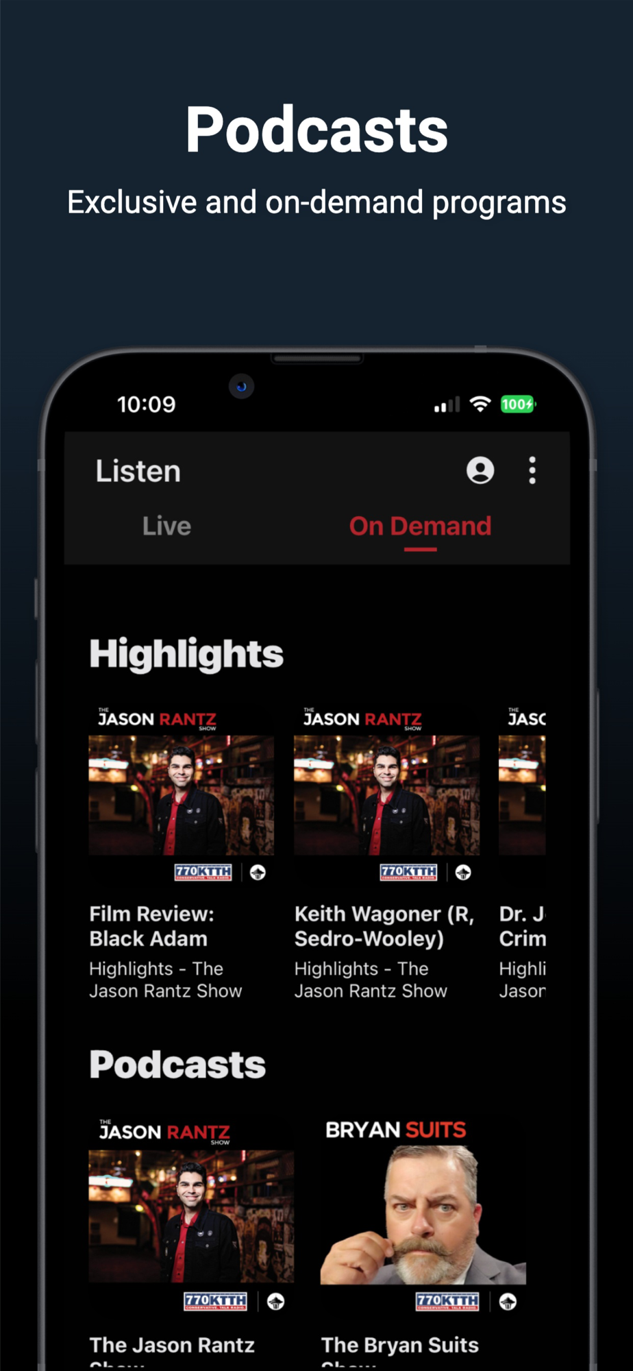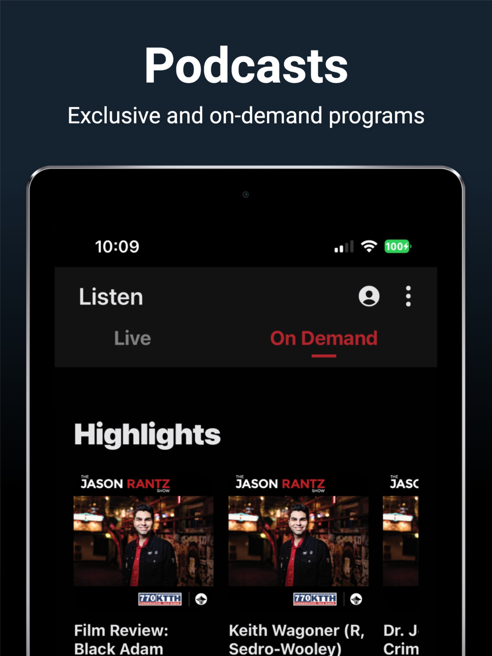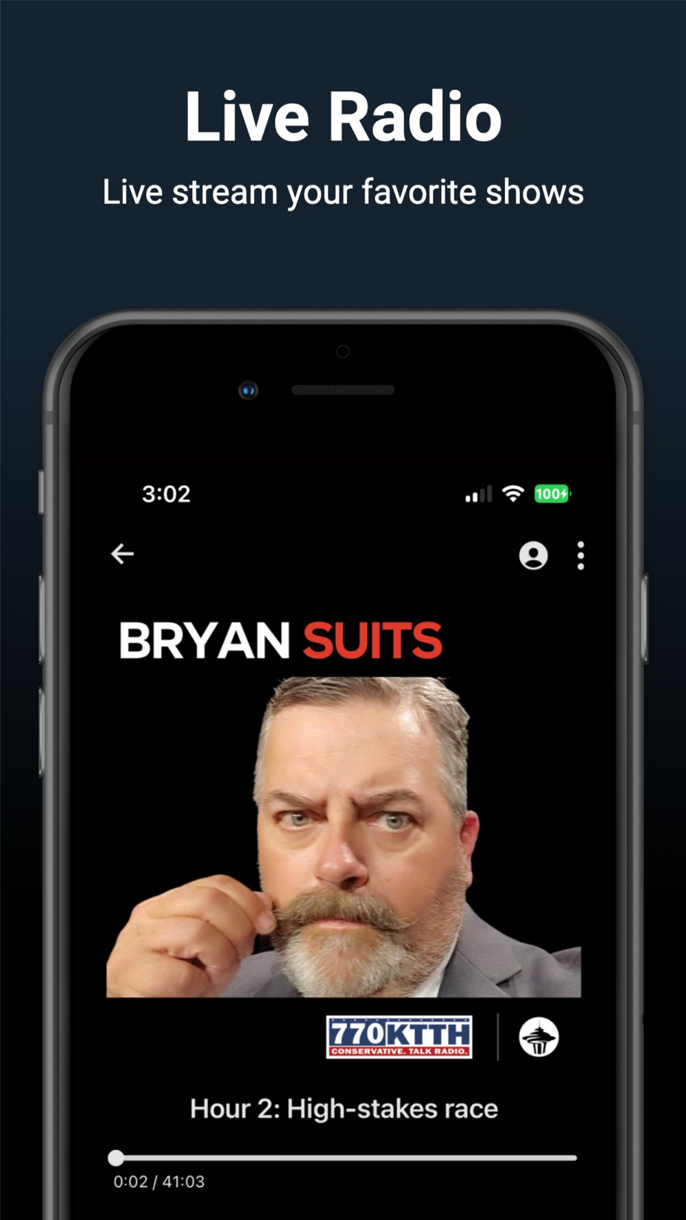 Your favorite KTTH talk shows live and on-demand in the palm of your hand: Bryan Suits, Dan Bongino, Michael Medved, Jason Rantz, Ben Shapiro, Michael Knowles, Mark Levin, and Guy Benson. Listen for free, anytime of day with crystal clear audio quality.