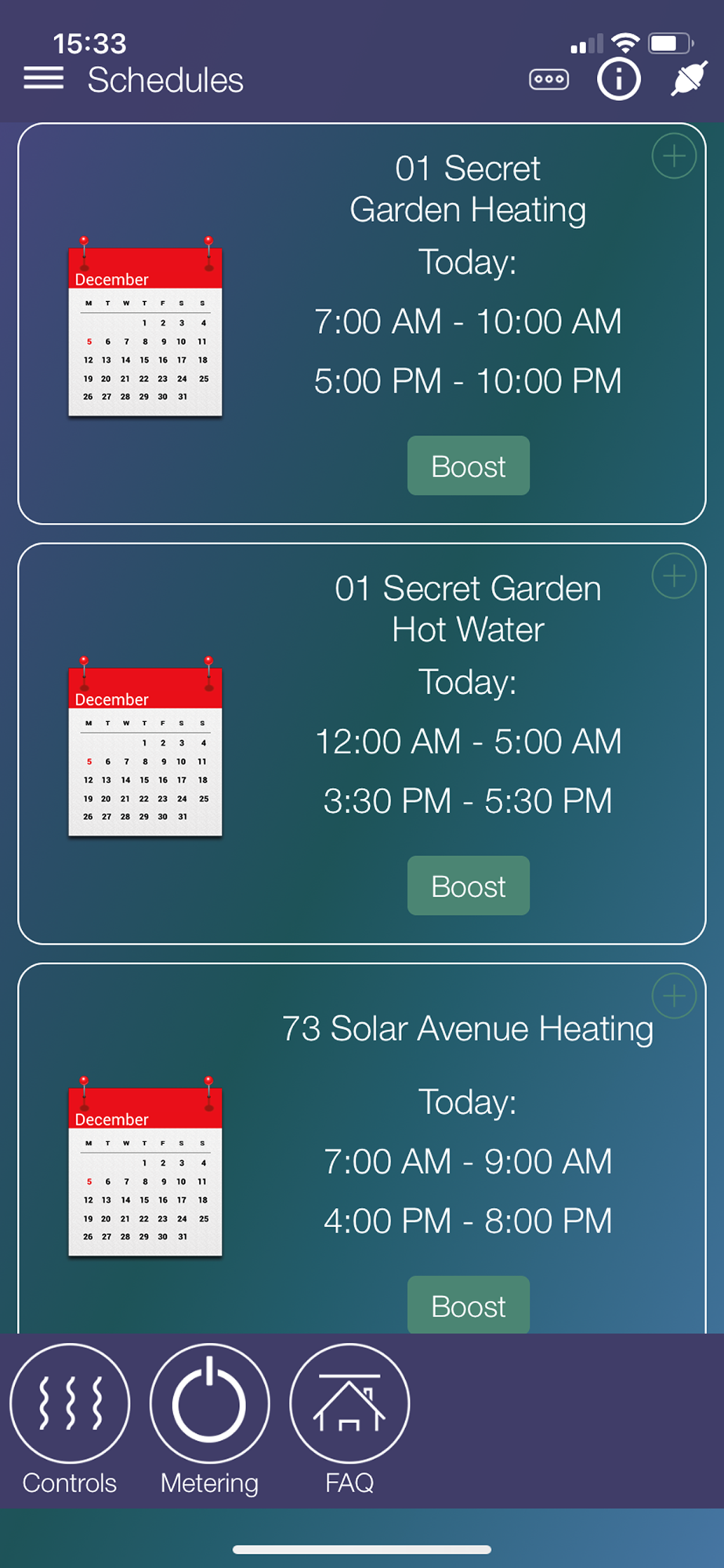 Control and interact with air conditioning units, under floor heating and lighting systems through dedicated widgets and groups. Set and configure mood lighting scenes using RGB and Dimmer widgets, and make those scenes available in simple mood selectors. Add groups of widgets for rooms in homes and offices for bedrooms and boardrooms, kitchens, bathrooms and offices. You can review graphs of conditions, change set-points, and receive only alarms that are relevant.
