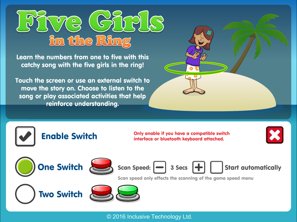 Just touch the screen or press a switch to play each verse of this easy to learn counting song which reinforces early number skills. Count up from one to five with the five girls in the ring as they sing a fun tune. The clear graphics, catchy tune and theme make this activity ideal for learners of all ages working on early number concepts. There are also two counting activities.