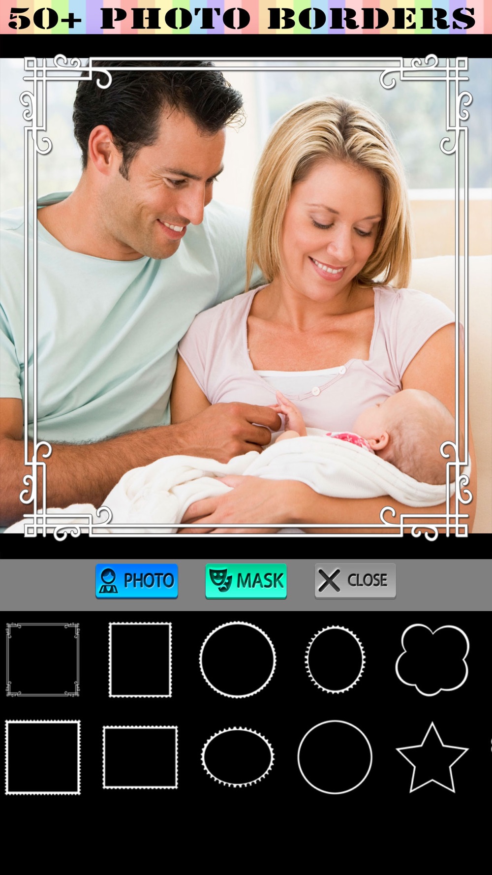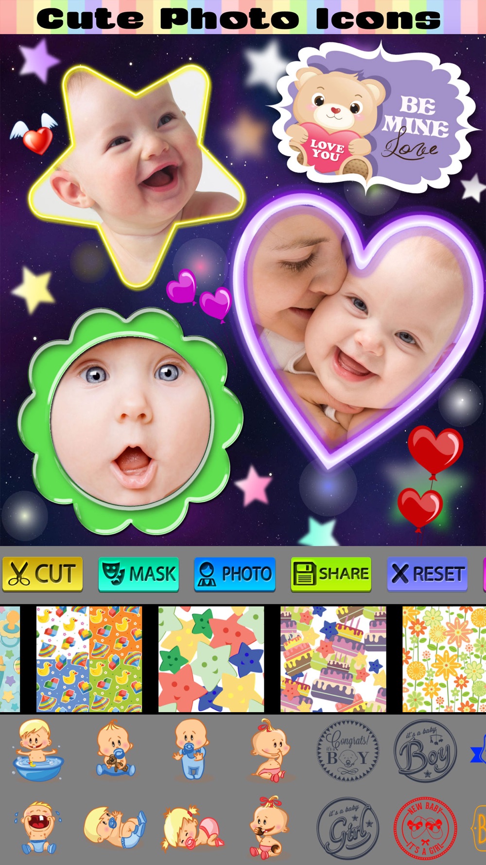 * Unique Photo Masks to create wonderful photo shapes, including bubbles,flowers, stars etc