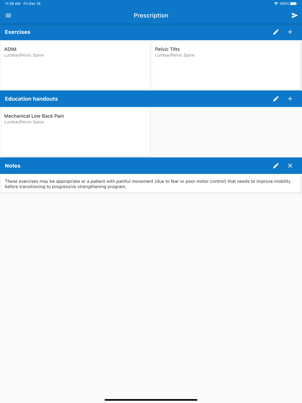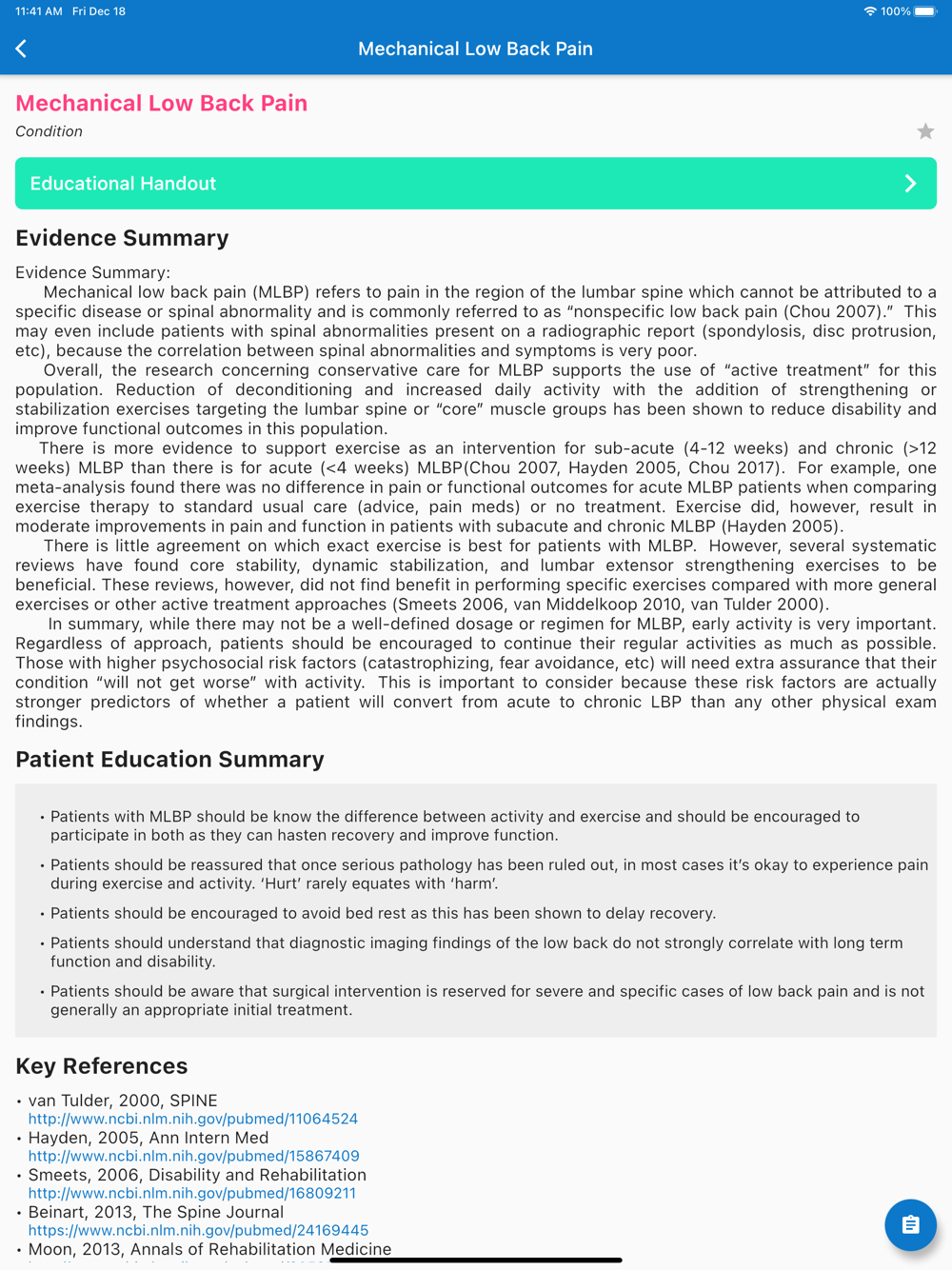 The app also serves as a powerful reference tool for clinicians. Evidence summaries covering the current state of published research related to the role of exercise for each common musculoskeletal disorder. Recommendations for patient education and research-based exercise dosing are also included.