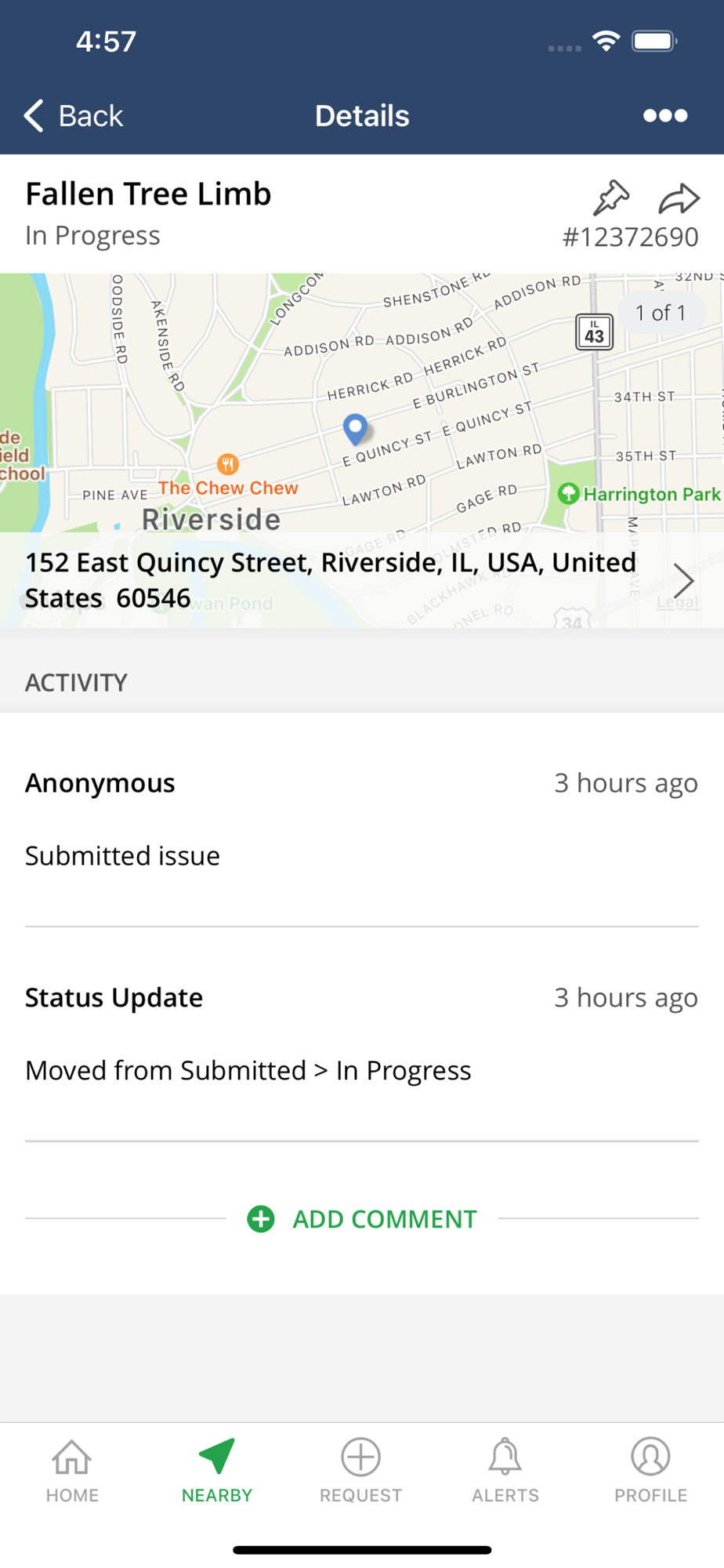 Use this application for direct access to Riverside, IL departments. Users may notify departments of any non-emergency issues, receive status updates on a reported issue, view other citizen requests, and be informed of village services.