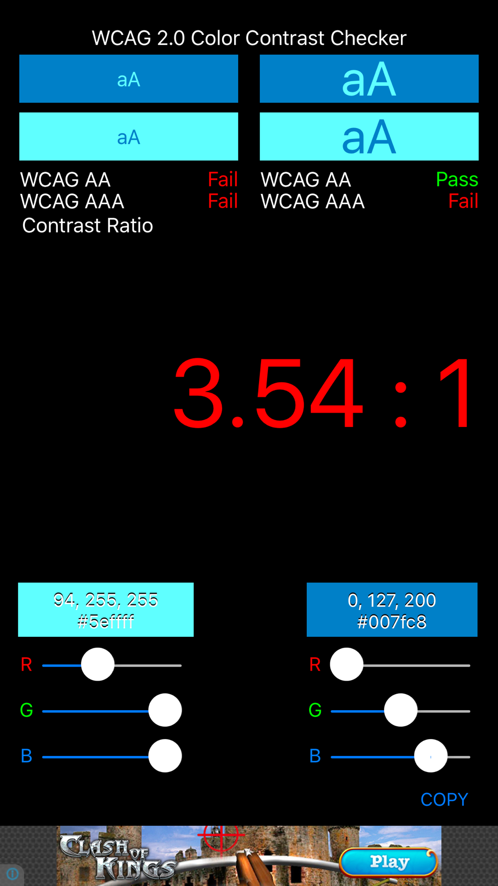ColorContrastChecker is an application that test has been proposed in the Web Content Accessibility Guidelines (WCAG) 2.0, the color of the contrast ratio achieved standards .