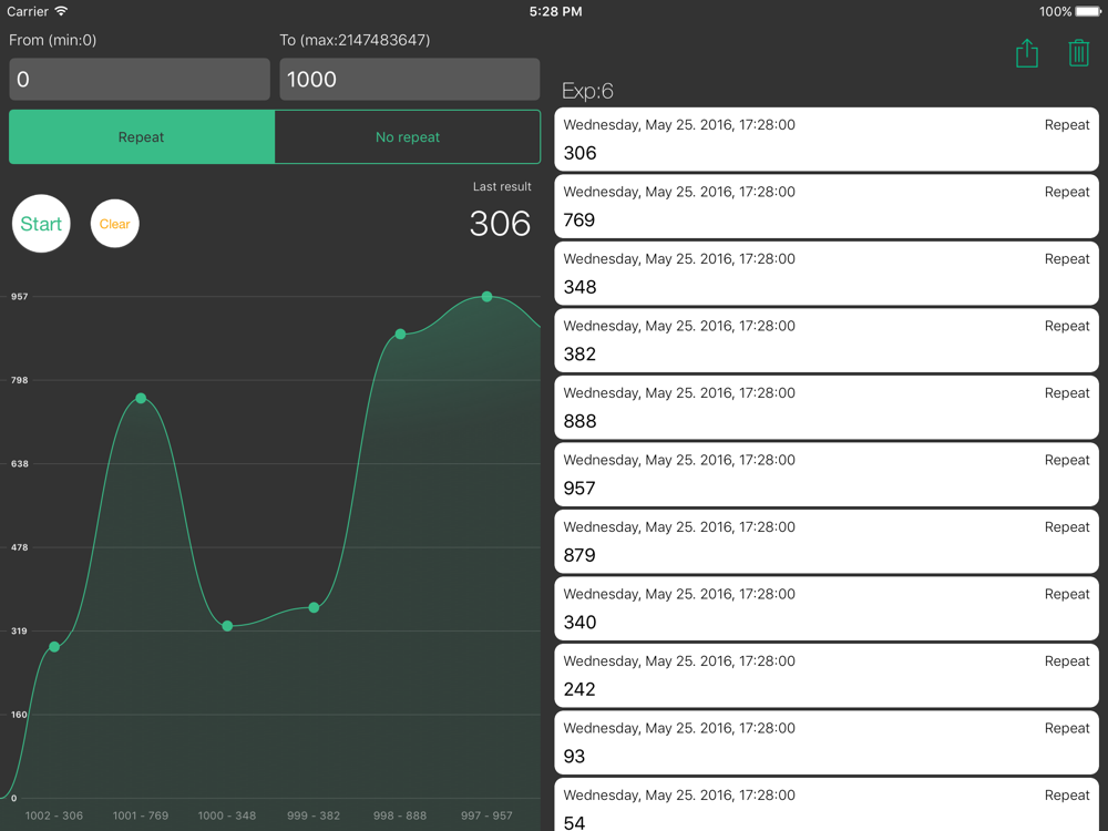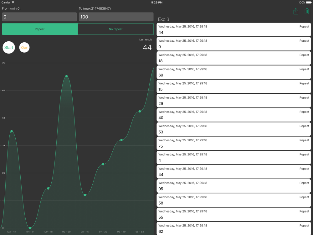 The Randomizator can generate true random numbers for any purpose you like. Simply enter your minimum and maximum values and tap the start button.