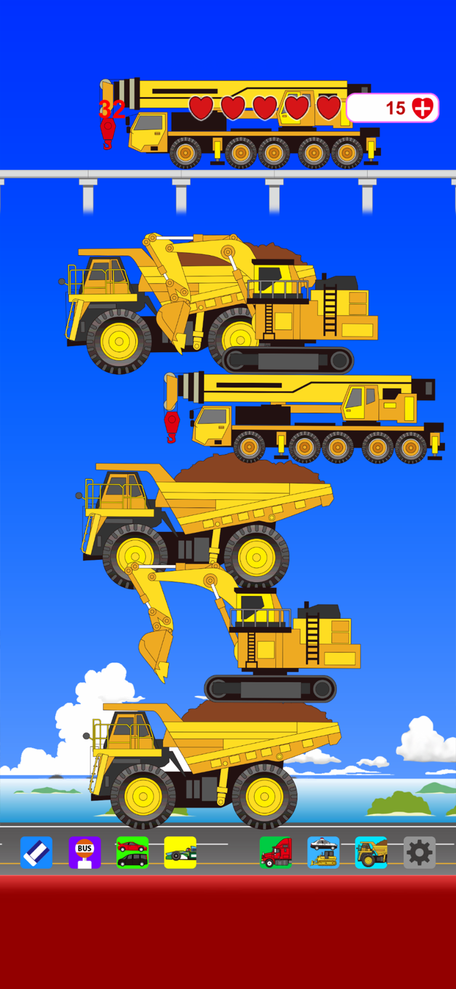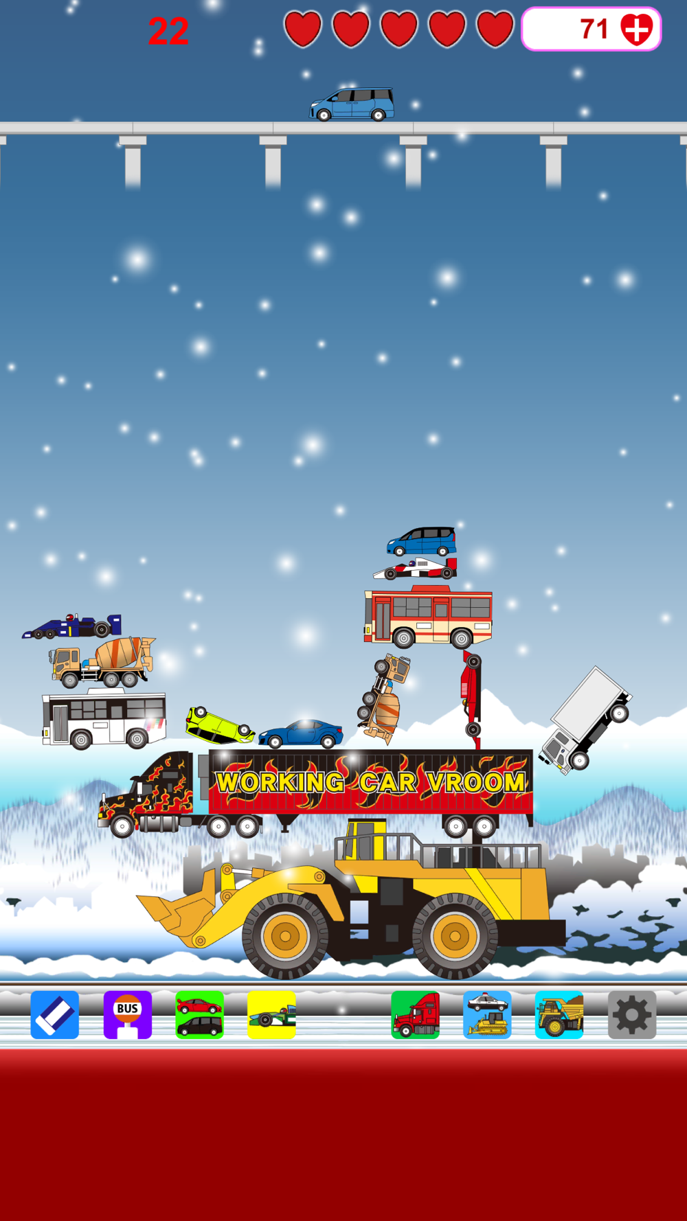By tapping the icon at the bottom of the screen, you can change the type of the next falling car to a general vehicle or a working vehicle.