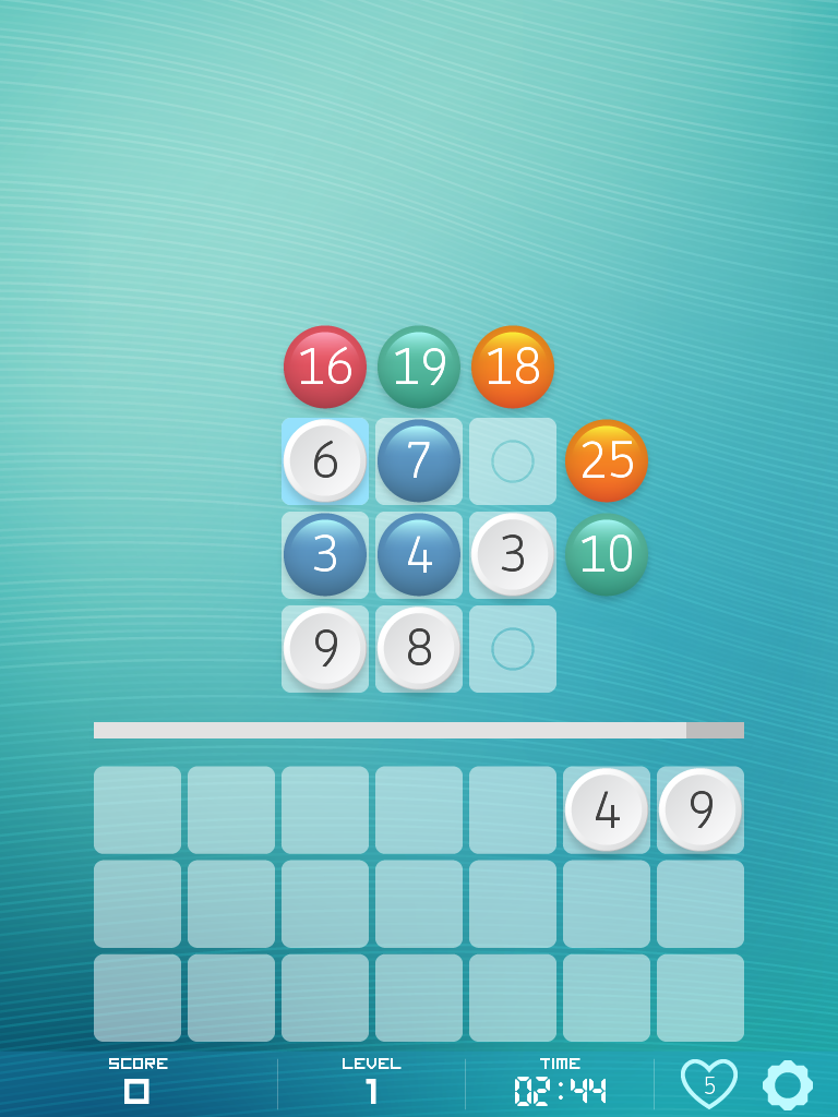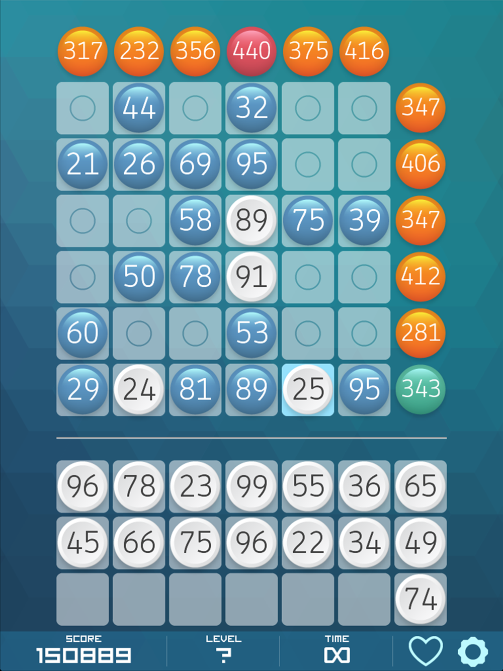 The goal of the game is to drag all white tokens at bottom and drop them to their correct positions. The puzzle will be solved when sum of each rows and columns equal to their corresponding token outside of the puzzle.