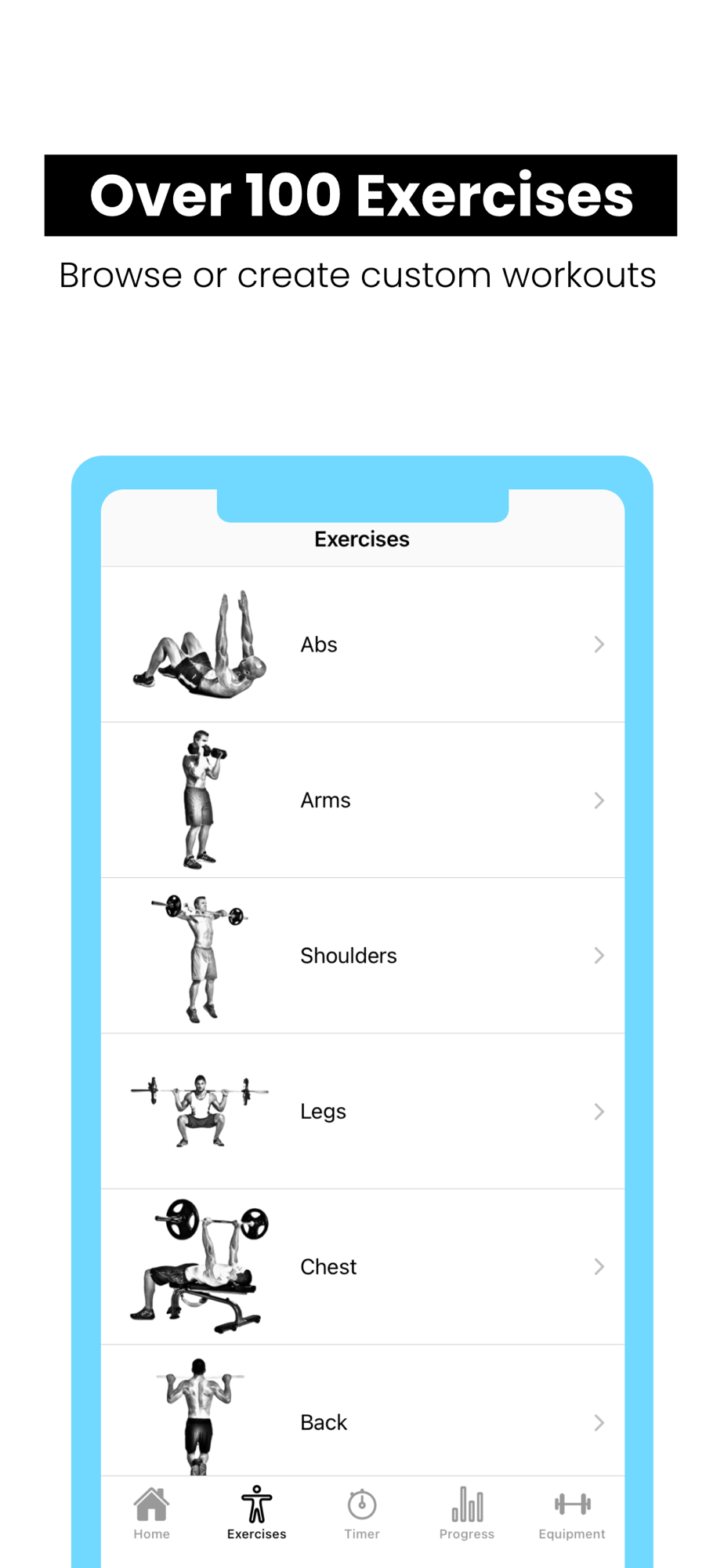 - Over 100 built-in exercises. These are found in our beginner, intermediate, and advanced workout plans, and are also available for creating custom workouts.