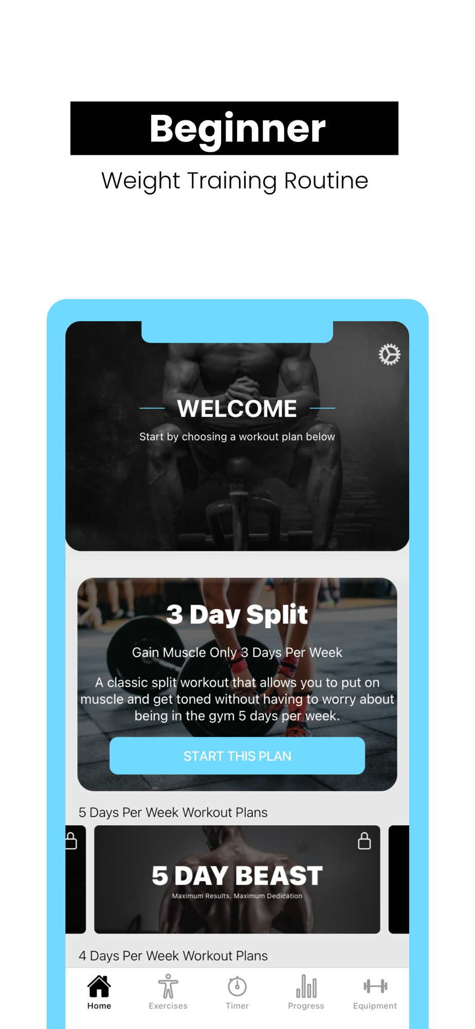 Beginner Weight Training Routine is considered a beginner to intermediate muscle building 3 day split. It ensures that you have enough rest to gain muscle, but also will challenge you with the muscle building workouts that are in the app.