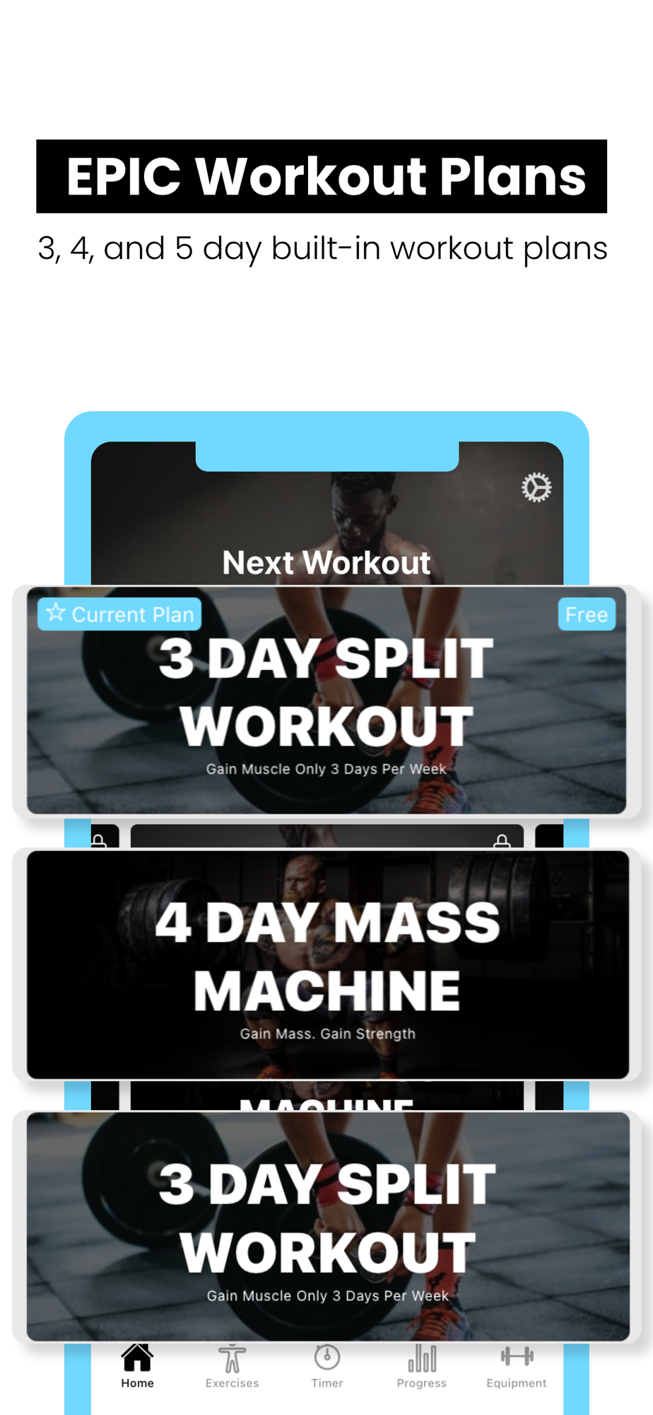 - 3 Built-in intermediate, 4 day workout plans