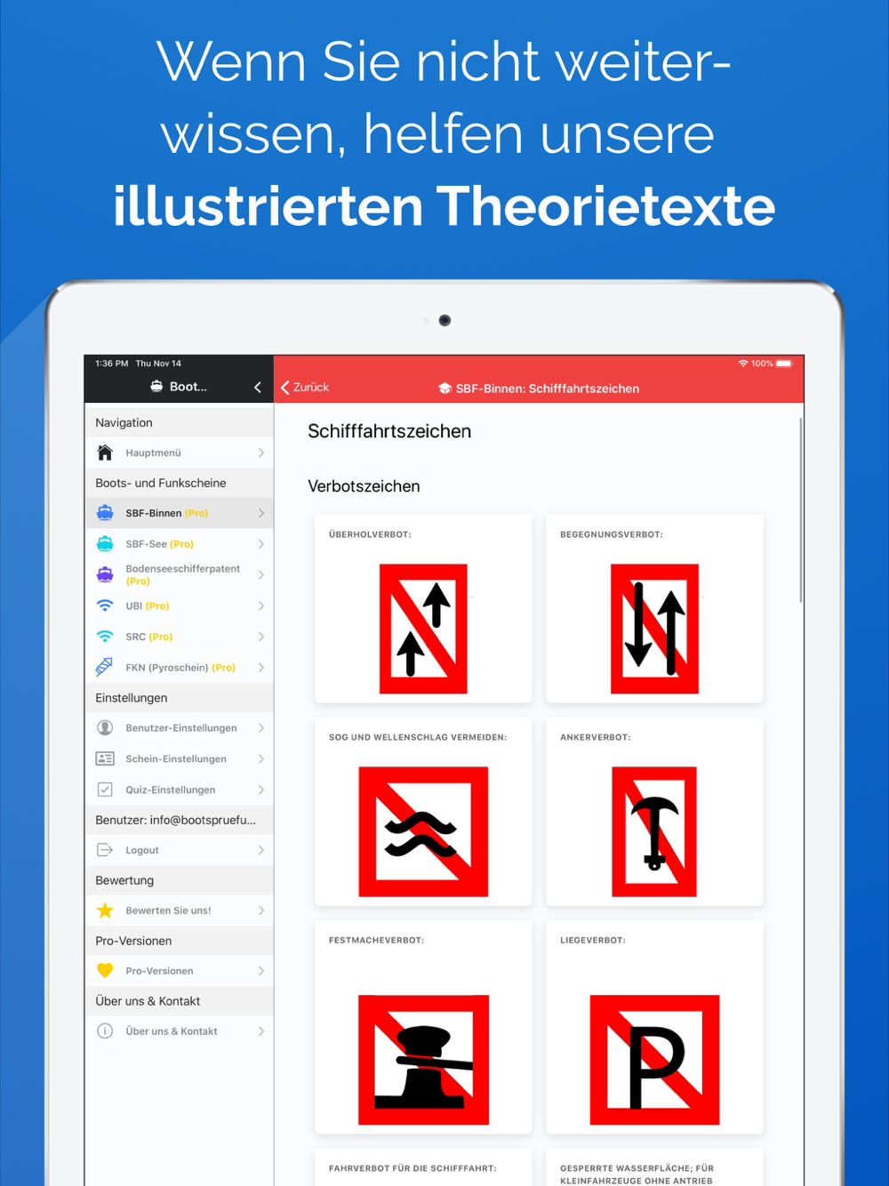 • Nutzer der Pro-Version können weitere Angebote nutzen, darunter unbegrenzte illustrierte Theorietexte zu allen Prüfungsfragen, Knoten-Anleitungen mit Fotos für die praktischen Bootsprüfungen, sämtliche SRC-Diktattexte in Text und Schrift, Musterfunksprüche fürs UBI, etc. etc.