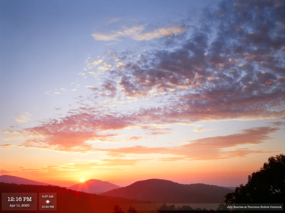 Pick your display mode: animated or not, with the image title or without it. The date and time dashboard can be enhanced by an additional panel, showing the time of the next sunrise and sunset.