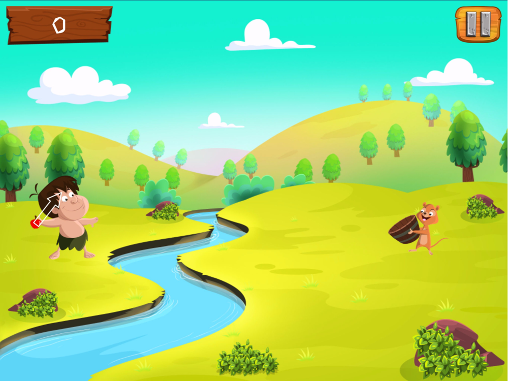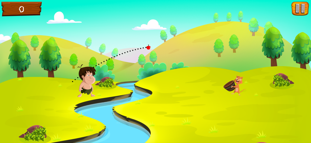Help Heo throw apples across the stream into the basket Poco is holding the basket but he is being mischievous. He keeps moving every time Heo throws an apple into the bucket.