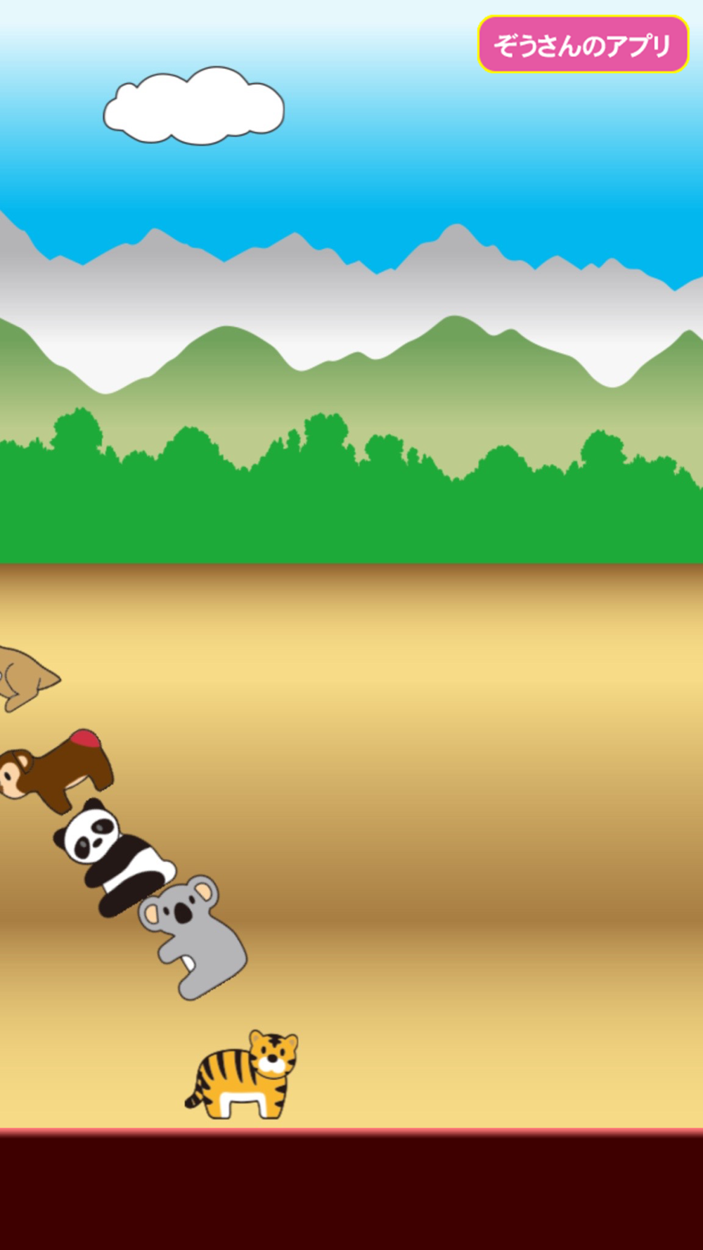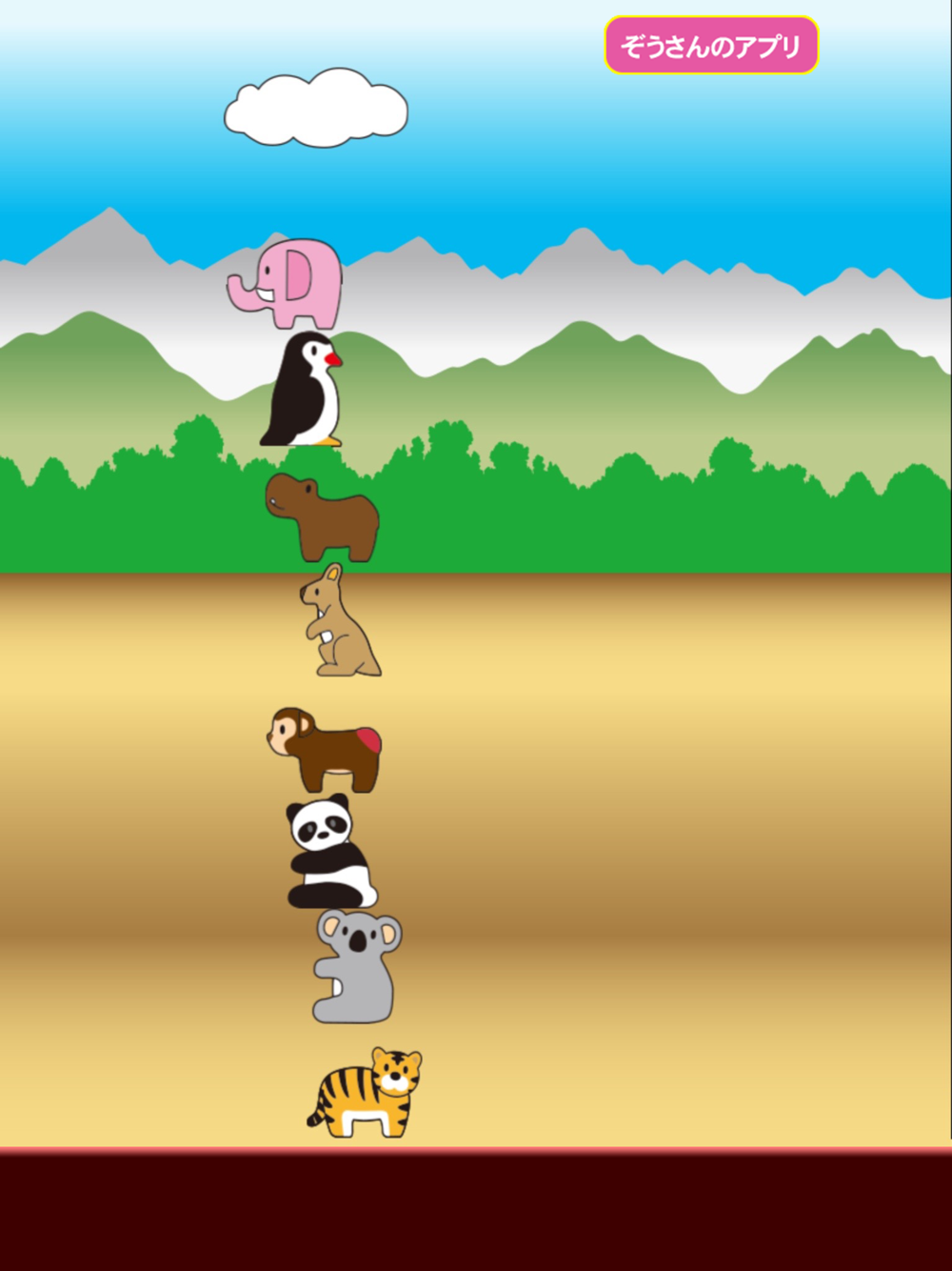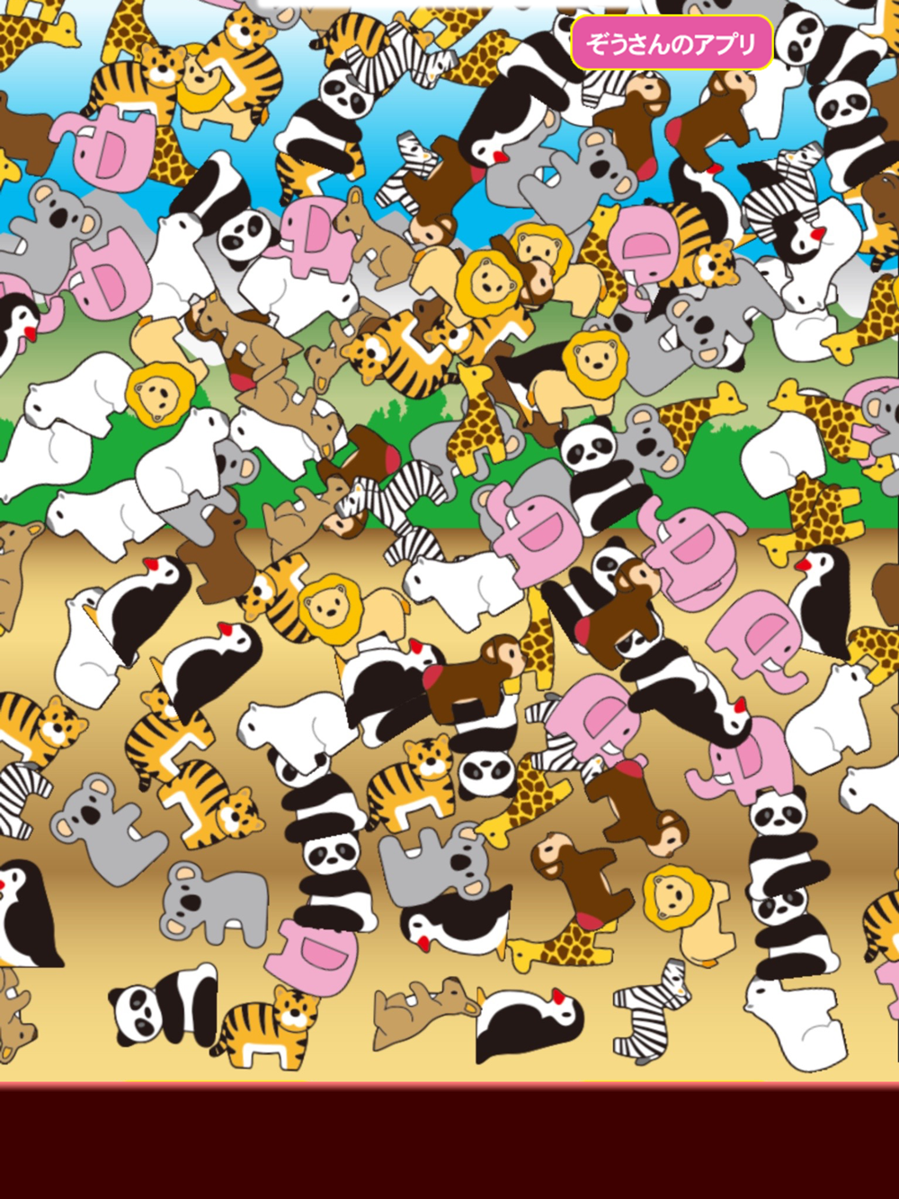 ライオン・ぞうさん・トラ・キリン・カバなどの色々な動物を積み上げたりちらかしたりして遊ぶことができます。