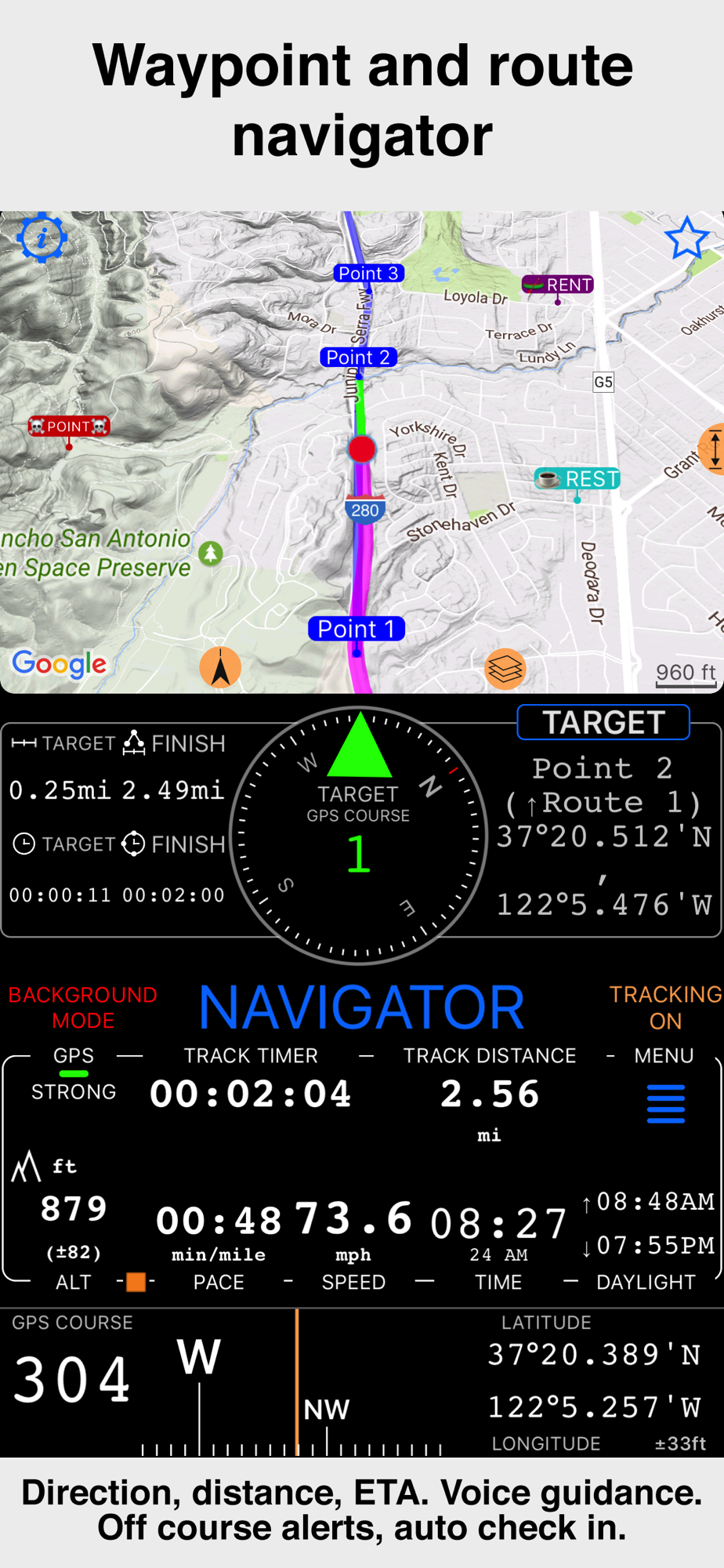 All-in-one assistant with a map, compass, GPS coordinates to view and share in 6 formats, altitude, distance, sunset/sunrise, speedometer with top and average speed, navigator to your target or along the route and a whole lot more!