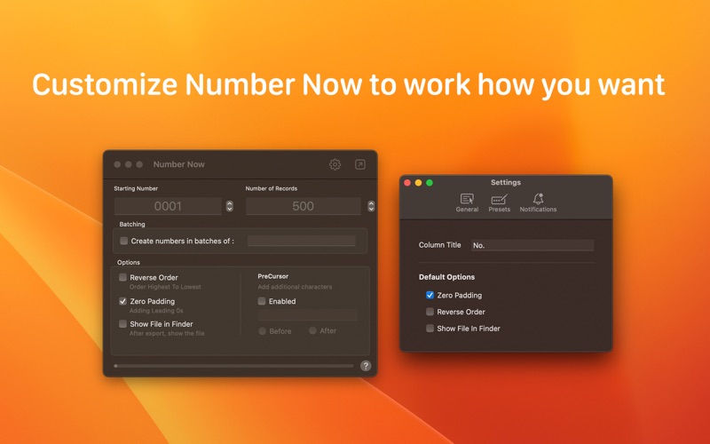 To increase your available options, Number Now also allows you to enable zero padding (001 instead of 1) with one click. We are also introducing PreCursor, which allows you to add characters before your numbering (E001 instead of 0001). Number Now can also automatically open files in the Finder after creation, and new menu items allow you to control all options and built in presets with mouse or keyboard commands.