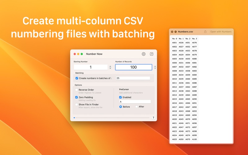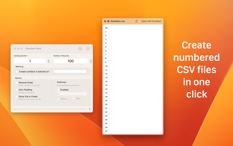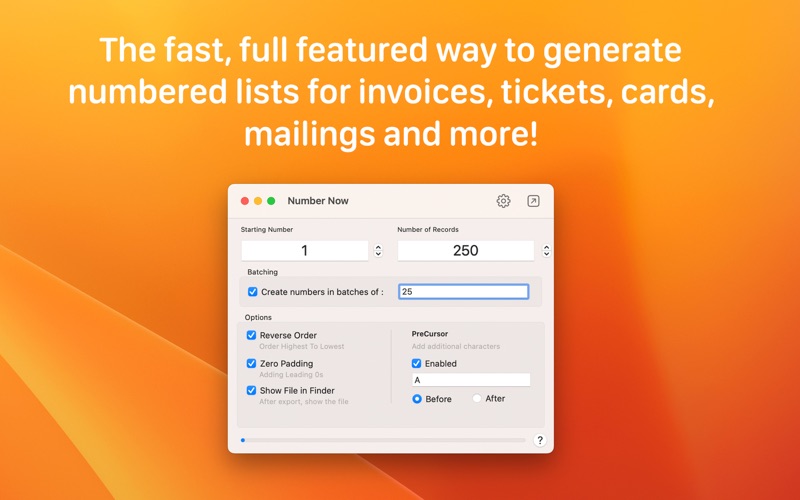 Number Now is designed for maximum efficiency. Tell it where to save your file, what number to start at and how many numbers you need. Within seconds, Number Now creates a CSV file that you can import into popular design and word processing programs and create a numbered document.