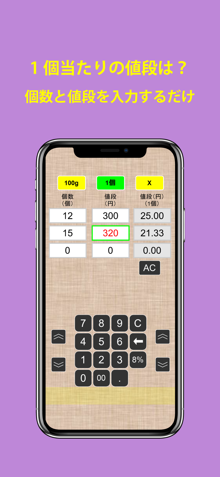 「1個お幾ら?」は複数個入りの1個あたりの値段を計算するアプリです。