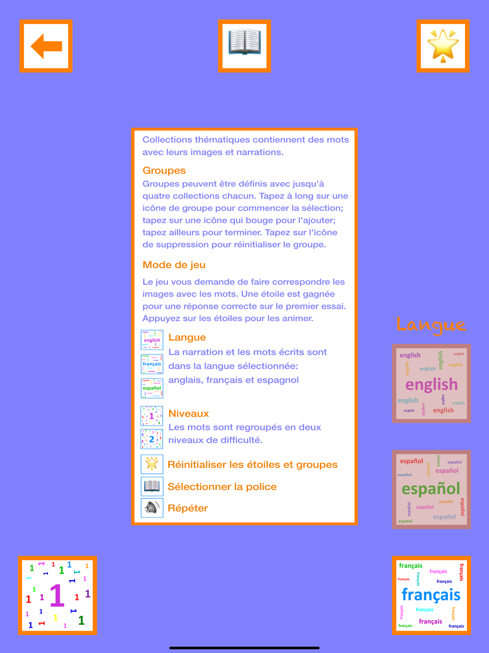 App with a delightful design with words grouped in themed collections, with their images and narrations in English, French, and Spanish.