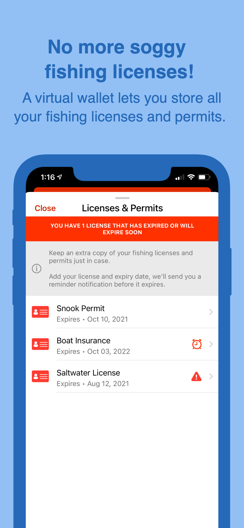 • DIGITAL WALLET [Premium Feature] - FishVerify makes it easy to securely store your fishing licenses, permits, boat insurance and more. Receive expiration notifications, and have all important information at your fingertips.